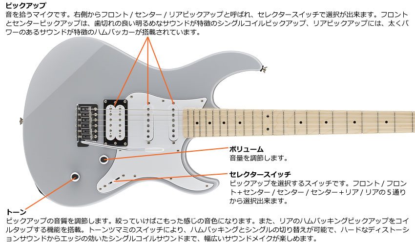 | YAMAHAのエレキギター「PACIFICA112VM」です。 正確な音程、高い演奏性、多彩な音色、高品質なサウンド。上級モデルで開発されたアイデアや技術を惜しみなく注ぎ込み、エレキギターの魅力を伝える、クオリティの高いモデルです。 ボディ材は、エレキギターやベースのスタンダード材とも言える「アルダー」を採用。バランスの良いサウンドで、粘りのある中音域も特徴です。弦を押さえる部分の指板には、クリアで抜けの良いサウンドで人気の「メイプル」を採用。オーソドックスなボディ形状と仕様で、ジャンルを選ばず幅広く使えるエントリーモデルで、これからギターを始める方におすすめのモデルです。 音を拾うマイク的な役割のピックアップには、アルニコVマグネットのピックアップを採用。クリアで音ヌケがよく、アンサンブルに埋もれないタイトなサウンドを生み出します。フロントとセンターピックアップには、歯切れの良いサウンドが特徴の「シングルコイル」、リアには太いサウンドが特徴の「ハムバッキング」ピックアップを「SSH(シングル-シングル-ハムバッキング)」レイアウトで搭載。ピックアップを選択する5WAYセレクタースイッチとの組み合わせで、多彩なサウンドメイクが可能です。