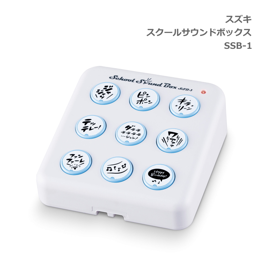 | 学校生活の様々なシーンで活用できる効果音を9種類収録したサウンドボックスです。盛り上げたい時、メリハリを付けたい時、集中させたい時など、シーン毎に使いやすい効果音を厳選しました。授業やイベントをより効果的に演出します。 ・幅広く使いやすい9種類の効果音を搭載。 ・大きくて押しやすく、音が一目で分かるボタンデザイン。 ・ボタンを押す毎に再生/停止する簡単操作で児童も容易に使えます。 ・教室の一番後ろまで届く豊かな音量(ボリューム調整可能)です。 ・手で握りやすい底面デザインで手持ち使用時もしっかりと保持できます。 ・電池駆動で小型軽量なのでどこでも使用できます。 ・落下防止に市販のネックストラップの装着が可能です。 【収録音と使用イメージ】9個の収録音と使用イメージです。授業中の先生のご指導のほか、児童のグループ発表や運動会、レクリエーションまで使いやすい効果音を収録しました。 ジャジャン:出題・何かを出す、見せる・注目を集める 等 ピンポーン:正解・クイズの回答権 等 キラリーン:ひらめいた・場面転換・いいね 等 テッテレー!:秘密道具を出す・成功した 等 ダラララ・・・ジャン!(ドラムロール):順位発表・重大発表・結果発表 等 ワァァァヒューヒュー(歓声):盛り上げる・賞賛する 等 ファンファーレ:たたえる・開始の合図・達成した 等 ♪〜(3分間BGM):シンキングタイム・瞑想・BGM 等 ※30秒毎に鐘の音(合図)が鳴り、3分で終了します。 Happy Birthday!:誕生日のお祝い | ||||||||||||