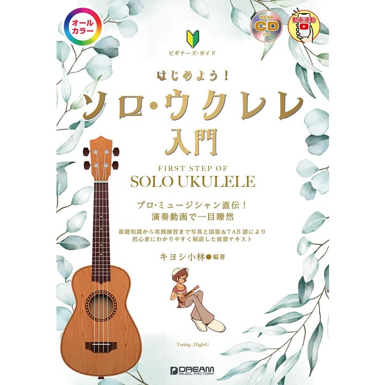 ウクレレ・マイスター、キヨシ小林が奥義を伝授する至宝の一冊!! 基礎知識から各種テクニックまで、初心者にわかりやすく解説した入門書です。メロディと伴奏をウクレレ1本で弾く演奏スタイルを“ソロ・ウクレレ”といいます。本書は、 単音ソロからコード・ソロへとレベル・アップ方式を取り入れた新しいスタイルの入門曲集です。模範演奏は全曲、模範演奏動画がQRコードから試聴出来ます。(Tuning : High-G)