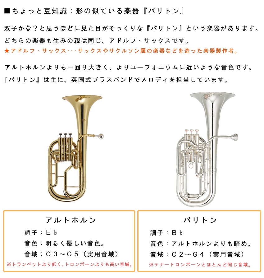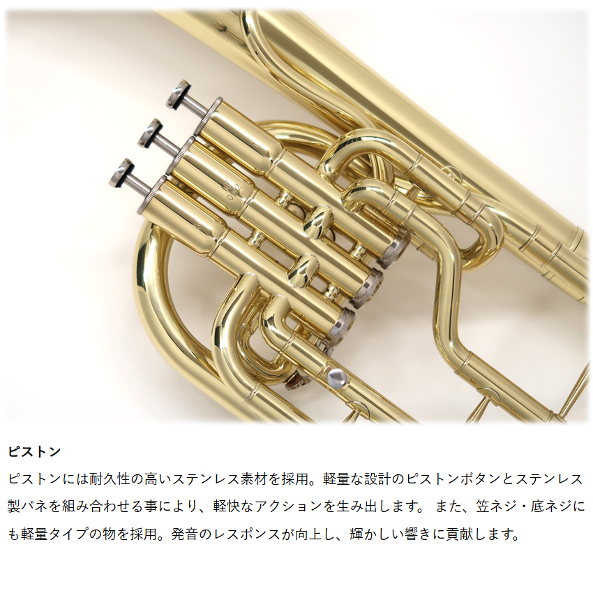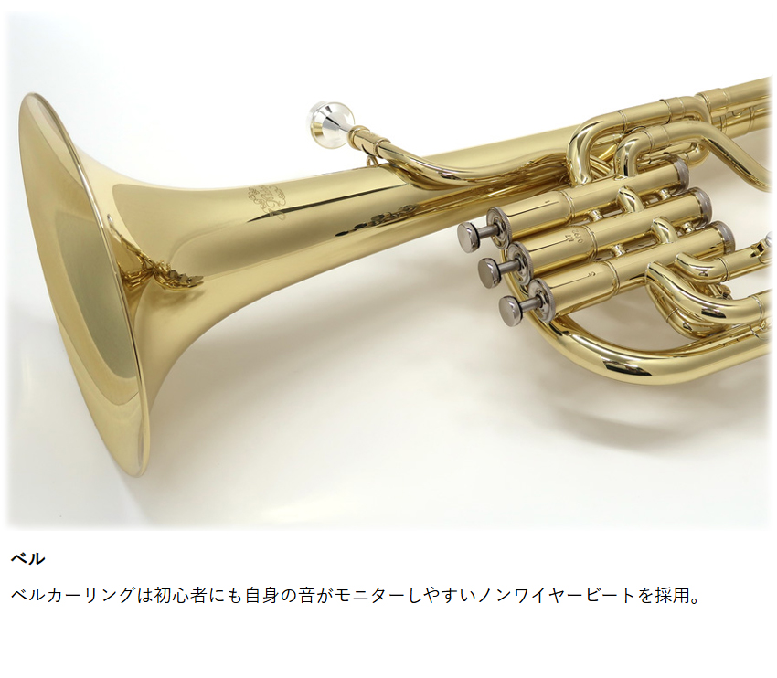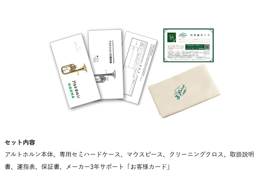 | マックコーポレーション株式会社販売の、J.Michael アルトホルン E♭ AH-600 クリアラッカー仕上げです。 【J.Michaelについて】 J.Michaelは、マックコーポレーション株式会社の管楽器専門スタッフが製品の開発に携わり、これまで培ってきたノウハウとプロ奏者との対話から生まれる意見をもとに改良を重ねており、低価格ながら高品質の楽器を実現しております。 そのコストパフォーマンスの高さから、日本だけでなく海外の代理店にも輸出されており、世界中のプレーヤーにご愛用いただいております。 【メーカーより】 アドルフサックスが考案したサクソルン属の楽器で、アルト音域を担当するアルトホルン。 より豊かな音色を求めて管のボアも太く、全体の設計も大ぶりな英国スタイルの設計を採用しました。 管のボアがトランペットやコルネットに近いステューデントモデルのアルトホルンと違い、合奏時にトランペットやコルネットとの音色の差をはっきり出すことができます。 小学校の金管バンドだけでなく、英国式金管金管バンドにチャレンジする方にも最適です。 【試奏してみた感想】 安価なピストンアクションの楽器を購入する際に最も心配な点は、本当にちゃんと動くかという点だと思います。 実際に試奏してみたところ、演奏に支障のないクオリティでした。 連符や高速パッセージでの演奏については、安価である以上、レスポンスが少しもたつく面はございました。 音色は、アルトホルンらしい柔らかく、あたたかな音色が再現されてました。 安価な割にしっかりしたクオリティがあるので、小学校の金管バンドや、英国式ブラスバンドの自宅練習用としてもよい楽器だと感じました。 【こんな方へオススメ】 昔少しやっていたけど、また趣味で吹いてみたいという方、ユーフォニアムを吹いていたけれど、置き場所がない方、価格でお悩みの方にもオススメします。 筆者は10年ほどのユーフォ吹きですが、"ちょっと楽器を吹きたいなぁ"という時にアルトホルンを持っていると良いかも・・・、と思いました。 ユーフォニアムは約4kgぐらいあるのに対し、アルトホルンは約1.6kgと軽量なので持ち運びも楽ですし、置き場所もユーフォニアムの半分くらいのスペースで済みます。 音量もユーフォニアムより小さいので、多少大きな音を出しても大丈夫な環境がある場合は、ご自宅等でも十分楽しめるのではないかと思います。 【アフターフォロー・検品について】 メーカーによる1年保証が付属しております。 また、万が一お届けした商品が不良だったということを未然に防ぐため、弊社出荷時には技術スタッフによる検品を行っております。 他にも、パーツが消耗した際もお取り寄せが可能となっております。 お届け後、お困りの際はお気軽にご連絡頂けますと幸いです。 |