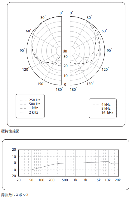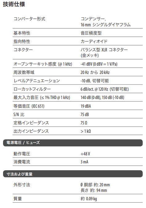 ◆コンデンサー型マイクロホン、ステレオペア 指向特性:カーディオイド ダイアフラム:16mm 周波数特性:20Hz〜20kHz 開回路感度: -41dBV (0dBV=1V/Pa) 最大音圧レベル:140dB(0dB、THD 1%) 等価雑音レベル:19dBA インピーダンス:100Ω SN比:75dB アッテネーション: −10dB フィルター:6dB/Oct(120Hz) インピーダンス:75Ω 端子:XLR3ピン(金メッキ)、オス 電源:ファンタム 48V、3mA 寸法(φ×全長):20×94mm 質量:約450g 付属品:マイクホルダー(3/8インチ→5/8インチ変換ねじ付)×2、ウインドスクリーン×2、ステレオバー(3/8インチねじ付)×1、キャリングケース×1 | ||