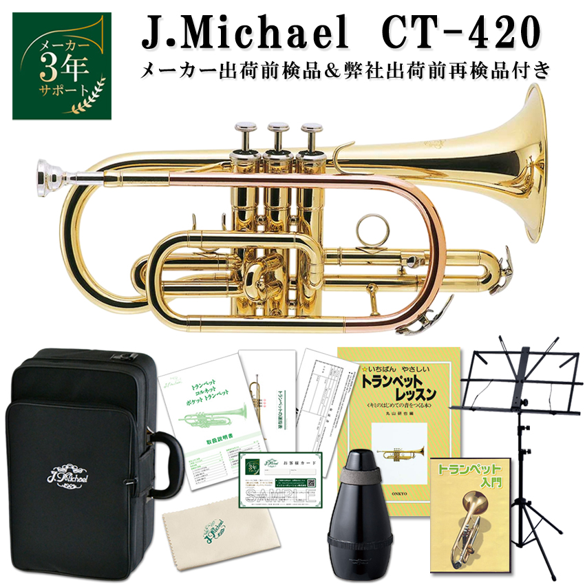 3年保証付き コルネット 初心者 セット お手入れ用品 教則本とDVD付き J.Michael CT-420 B♭ クリアラッカー 2回検品後発送 趣味 吹奏楽 ブラスバンド 練習 入門