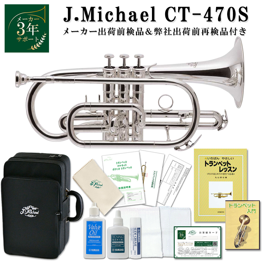 3年保証付き コルネット 初心者 セット ミュート 譜面台 教則本 DVD付き J.Michael CT-470S B♭ 銀メッキ 2回検品 趣味 吹奏楽 ブラスバンド 練習 入門