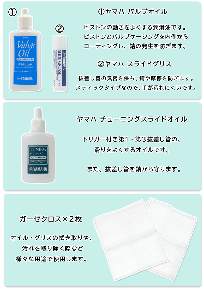 お手入れ用品は、コルネットのお手入れに必要最低限の内容をお付けしております。
