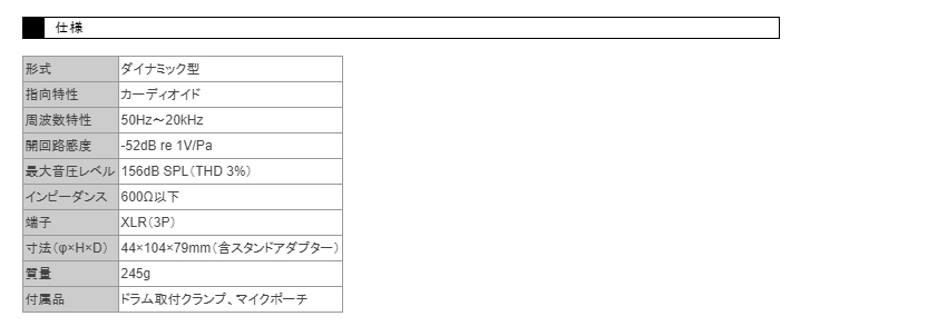【メーカーより】・ダイヤフラムの厚みを中心部と外縁部で変えることで、ダイヤフラムの動きを適切に制御する独自のバリモーション・テクノロジーを採用。透き通るようなクリアな高域を実現するとともに、低域の迫力もありのままに収音。・最大音圧レベルは156dBにもおよび、大音圧にも余裕で対応。 ・マイクスタンドに直接取り付け可能。ドラムのリムなどに取り付けできるクランプも付属。 ・内部のウインドスクリーンがノイズをカットし、屋外でのライブでも活躍。