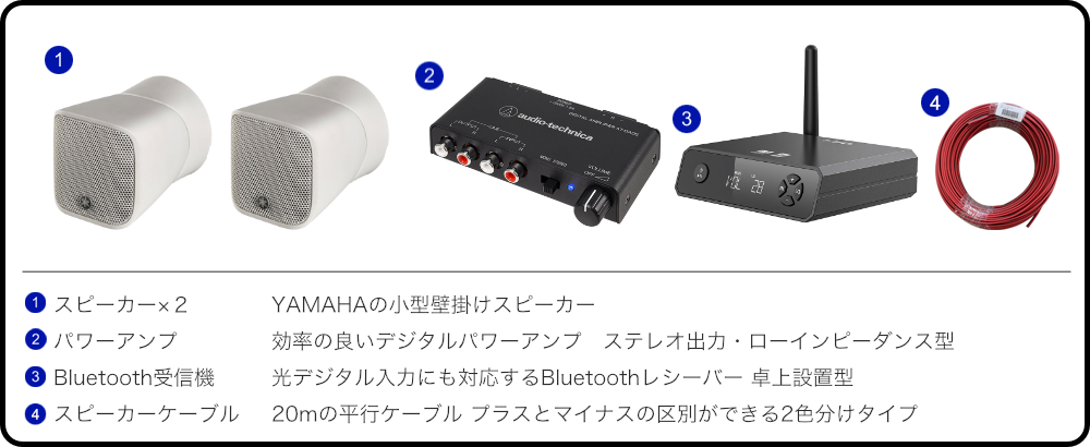 | 【セット内容】YAMAHA 小型スピーカー ×2/BGM用アンプ×1/10mスピーカーケーブル×2/Bluetoothレシーバー | ||||||||||