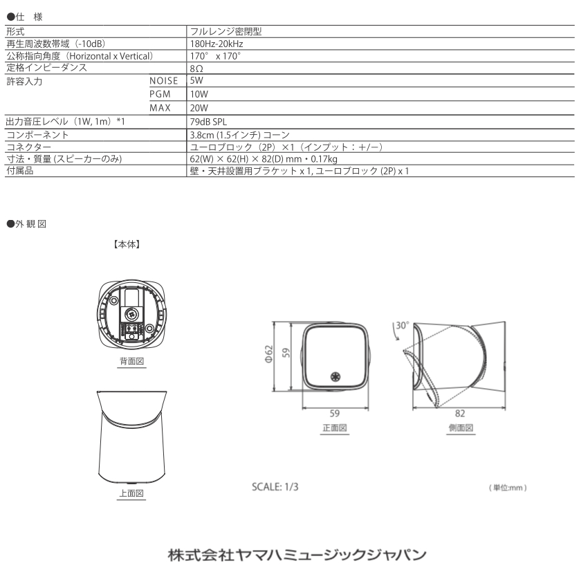 【スピーカーの特徴】 コンパクトなスピーカーシステムにおいては時に、音質が犠牲となります。VXSシリーズ『Mモデル』には、ヤマハが50年の歴史を持つスピーカー開発の過程で培った技術を惜しみなく注ぎ込んだ、新開発の1.5インチ(3.75cm)フルレンジユニットを搭載。大口径ボイスコイルとネオジム磁石を贅沢に使用し、そのサイズからは想像できないワイドな周波数再生帯域と歪みのない高品位な音を実現しました。さらに、水平170°x 垂直170°の広い指向角により、スピーカーの存在を意識させない、まるで空間を包み込むような均一な音場を実現します。 まさにBGMのために生まれた、理想のスピーカーシステムです。 | ||||||||||