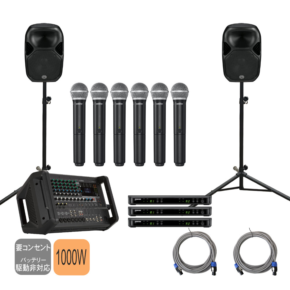 | Q.マイクは何本まで接続できますか? A.ワイヤレスマイク・ワイヤードマイク合わせて8本まで接続できます。 Q.モニタースピーカーは接続できますか? A.はい。パワードタイプのモニタースピーカーが接続できます。(アンプ+パッシブスピーカーでも可) Q. 電池またはバッテリーで使用することはできますか? A. 当セットは電池駆動に対応していません。AC 電源でお使いください。電池駆動可能なスピーカーのお取り扱いもございますので、お求めの方は当社のPAセットページをご覧頂けましたら幸いです。 Q. セットのほかに必要なものはありますか? A. 当セットの内容物のみで音は出力できますが、必要に応じてマイクやケーブルをご用意下さい。 | ||||||||||||
