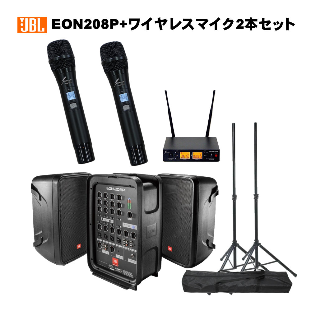 JBL ポータブルPAシステム EON208P/スピーカースタンド(スピーカースタンドケース付き)/ワイヤレスシステム(ワイヤレスマイク2本、2ch受信機)/接続ケーブル