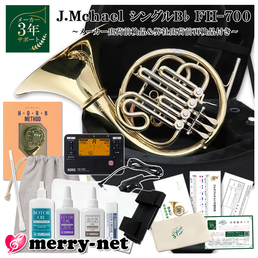 マックコーポレーション株式会社販売の、J.Michael フレンチホルン B♭ シングル FH-700 デタッチャブル式です。 【J.Michaelについて】 J.Michaelは、マックコーポレーション株式会社の管楽器専門スタッフが製品の開発に携わり、これまで培ってきたノウハウとプロ奏者との対話から生まれる意見をもとに改良を重ねており、低価格ながら高品質の楽器を実現しております。 そのコストパフォーマンスの高さから、日本だけでなく海外の代理店にも輸出されており、世界中のプレーヤーにご愛用いただいております。 【メーカーより商品紹介】 初心者にも鳴らしやすいB♭シングルフレンチホルン フレンチホルンの入門編として最適なシングルフレンチホルン。 シンプルな設計で重さも吹奏感も軽く、初心者や学生でも鳴らしやすいフレンチホルンです。 シングルフレンチホルンは一般的に調子がF調とB♭調がありますが、こちらのモデルは抵抗感も軽く音程的にも安定しているB♭調を採用。 音程補正用のゲシュトップキィも搭載されています。 【こんな方へおすすめ!】 ・お子様のはじめての楽器として ・続ける自信はないけど、チャレンジしてみたい ・また趣味として久しぶりに吹いてみたい ・小学生以下のクラブ活動(鼓笛隊・ブラスバンド)で自分の楽器を持たせたい ・ちょっとした遊び感覚で他の楽器を吹いてみたい金管奏者の方 【セット内容品について】 ホルンのお手入れに必要な基本のグッズと、チューナーメトロノーム&ピックアップマイク、教則本セット、ホルンストラップをお付けしております。 ・お手入れ用品について ホルンには、音程を変える(管の長さを変える)仕組みに「ロータリー」が使われています。 このロータリーのお手入れに必要なオイルは、最低でも3種類が必要となります。 オイルは使用する場所が決まっており、場所に適していないオイルを使用してしまうと故障の原因となります。 本セットには必要なヤマハのオイル3種類と、ロータリーへの注入に使うノズル、 更に、抜差し管のお手入れに必要なグリスや、古いグリスを拭き取るガーゼもお付けしております。 これだけ揃っていれば、ホルンを十分にお手入れすることが出来ます。 ・チューナーメトロノーム&ピックアップマイクについて ホルンの練習に欠かせないものの一つです。 チューナーメトロノームは名前の通りメトロノームの機能もついておりますので、 まっすぐ音を伸ばるようにするロングトーンの基礎練習から、曲の練習にまで役立ちます。 ピックアップマイクを使えば、自分の楽器の音を集中的に拾うことが出来るので、周囲の音に影響されません。 ・教則本について 部活動での個人練習でも用いられている、ホルン教本です。 ホルンを演奏する際の正しい姿勢や、右手の入れ方、音の出し方など、 基礎中の基礎から内容されている初心者の方におすすめの教本です。 基礎の応用曲が計62曲収録されており、奏法のテクニックと歌心を身に付けていくことが出来ます。 ・ホルンストラップについて ホルンへ取り付けることで、左手の小指の負荷を軽減するだけでなく、正しい構え方を身に付けることも出来ます。 また、左指が動きやすくなるので、レバーが押さえやすくなります。 【試奏した感想】 シングルのB♭管なので管の全長が短い分、 初心者の方や息の量があまりない方でも、比較的吹きやすいのではないかと感じました。 ロータリーの動きについては、ものすごく素早い音符(例えば非常に細かいトリルなど)のような、 非常に機敏な動作を要する演奏については得意ではないですが、 大凡の曲は問題なく演奏できるくらいの機動性でした。 ヤマハなどのホルンですと、安いモデルでもおおよそ30万円以上の価格になります。 しかしながら、FH-700は本体のみで1ケタ万円代の価格にも関わらずちゃんとロータリーが動くので、 非常にコストパフォーマンスに優れており、これから楽器を初めてみようかなという方の初めの楽器としては、 十分なクオリティではないかと思います。 ひとつ気になる点としては、右手を入れる場所が遠く、管の内径が広い場所となりますので、 手が小さい方にとっては右手を入れる方法にコツが必要となるかもしれません。 FH-850の方が右手を入れる位置の内径は狭いですが、 フルダブルホルンとなりますのでFH-700よりも息やパワーの量が必要になります。 【アフターフォロー・検品について】 メーカーにて検品出荷されたものを、弊社にて再度検品し、発送致します。 メーカーによる1年保証と、3年サポートが付属しております。 楽器の不具合が見受けられた際や修理をご希望の場合は、まず弊社までご連絡下さい。 パーツが消耗場合は、パーツのお取り寄せが可能となっております。 お届け後、何かお困りのことがございましたらお気軽にご連絡下さい。 |
