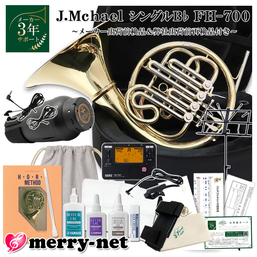 | マックコーポレーション株式会社販売の、J.Michael フレンチホルン B♭ シングル FH-700 デタッチャブル式です。 【J.Michaelについて】 J.Michaelは、マックコーポレーション株式会社の管楽器専門スタッフが製品の開発に携わり、これまで培ってきたノウハウとプロ奏者との対話から生まれる意見をもとに改良を重ねており、低価格ながら高品質の楽器を実現しております。 そのコストパフォーマンスの高さから、日本だけでなく海外の代理店にも輸出されており、世界中のプレーヤーにご愛用いただいております。 【メーカーより商品紹介】 初心者にも鳴らしやすいB♭シングルフレンチホルン フレンチホルンの入門編として最適なシングルフレンチホルン。 シンプルな設計で重さも吹奏感も軽く、初心者や学生でも鳴らしやすいフレンチホルンです。 シングルフレンチホルンは一般的に調子がF調とB♭調がありますが、こちらのモデルは抵抗感も軽く音程的にも安定しているB♭調を採用。 音程補正用のゲシュトップキィも搭載されています。 【こんな方へおすすめ!】 ・お子様のはじめての楽器として ・続ける自信はないけど、チャレンジしてみたい ・また趣味として久しぶりに吹いてみたい ・小学生以下のクラブ活動(鼓笛隊・ブラスバンド)で自分の楽器を持たせたい ・ちょっとした遊び感覚で他の楽器を吹いてみたい金管奏者の方 【セット内容品について】 ホルンのお手入れに必要な基本のグッズと収納に便利な巾着袋、チューナーメトロノーム&ピックアップマイク、教則本、ベストブラスの電子ミュートイーブラス、そしてホルンストラップをお付けしております。 ・お手入れ用品について ホルンには、音程を変える(管の長さを変える)仕組みに「ロータリー」が使われています。 このロータリーのお手入れに必要なオイルは、最低でも3種類が必要となります。 オイルは使用する場所が決まっており、場所に適していないオイルを使用してしまうと故障の原因となります。 本セットには必要なヤマハのオイル3種類と、ロータリーへの注入に使うノズル、 更に、抜差し管のお手入れに必要なグリスや、古いグリスを拭き取るガーゼもお付けしております。 これだけ揃っていれば、ホルンを十分にお手入れすることが出来ます。 ・チューナーメトロノーム&ピックアップマイクについて ホルンの練習に欠かせないものの一つです。 チューナーメトロノームは名前の通りメトロノームの機能もついておりますので、 まっすぐ音を伸ばるようにするロングトーンの基礎練習から、曲の練習にまで役立ちます。 ピックアップマイクを使えば、自分の楽器の音を集中的に拾うことが出来るので、周囲の音に影響されません。 ・教則本について 部活動での個人練習でも用いられている、ホルン教本です。 ホルンを演奏する際の正しい姿勢や、右手の入れ方、音の出し方など、 基礎中の基礎から内容されている初心者の方におすすめの教本です。 基礎の応用曲が計62曲収録されており、奏法のテクニックと歌心を身に付けていくことが出来ます。 ・電子ミュート イーブラスについて ホルンの音量を小声の会話程度まで落としつつ、イヤフォンで自分の音を聞きながら練習することが出来るベストブラスのミュート、イーブラスです。 実際にご使用頂くとよく分かるのですが、ミュート部分が楽器の振動を不自然に打ち消さないので、吹奏感が心地よいと感じました。 また、コードがイヤフォンのみで済むので、練習中の煩わしさが少ない部分も特徴です。 [サイレントブラスとの比較について] 個人的にはサイレントブラスよりもイーブラスのほうが圧迫感が少なく、ミュートを取り付けた際のストレスが少ないと感じました。 ヤマハのサイレントブラスのほうが様々な機能があり、イヤフォンから聞こえる音のクオリティも非常に高いですが、 使用時におけるストレスの低さの面については、イーブラスの方が優秀だと個人的には感じました。 ・ホルンストラップについて ホルンへ取り付けることで、左手の小指の負荷を軽減するだけでなく、正しい構え方を身に付けることも出来ます。 また、左指が動きやすくなるので、レバーが押さえやすくなります。 【試奏した感想】 シングルのB♭管なので管の全長が短い分、 初心者の方や息の量があまりない方でも、比較的吹きやすいのではないかと感じました。 ロータリーの動きについては、ものすごく素早い音符(例えば非常に細かいトリルなど)のような、 非常に機敏な動作を要する演奏については得意ではないですが、 大凡の曲は問題なく演奏できるくらいの機動性でした。 ヤマハなどのホルンですと、安いモデルでもおおよそ30万円以上の価格になります。 しかしながら、FH-700は本体のみで1ケタ万円代の価格にも関わらずちゃんとロータリーが動くので、 非常にコストパフォーマンスに優れており、これから楽器を初めてみようかなという方の初めの楽器としては、 十分な