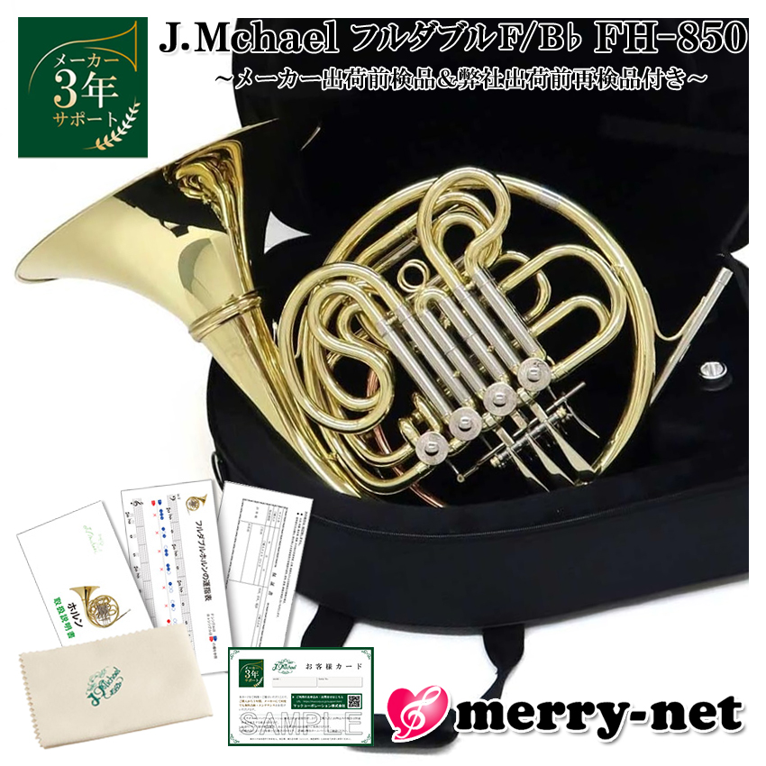 | マックコーポレーション株式会社販売の、J.Michael フレンチホルン F / B♭ フルダブル FH-850 デタッチャブル式です。 【J.Michaelについて】 J.Michaelは、マックコーポレーション株式会社の管楽器専門スタッフが製品の開発に携わり、これまで培ってきたノウハウとプロ奏者との対話から生まれる意見をもとに改良を重ねており、低価格ながら高品質の楽器を実現しております。 そのコストパフォーマンスの高さから、日本だけでなく海外の代理店にも輸出されており、世界中のプレーヤーにご愛用いただいております。 【メーカーより商品紹介】 吹奏楽・オーケストラに最適なフルダブルフレンチホルン 元東京佼成ウインドオーケストラホルン奏者木村淳先生の監修を受けた、弊社のロングセラーフレンチホルン。 全体の設計だけでなく、抜き差し管の素材や、ロータリーキャップにも見直しが加えられ、常に進化を遂げてきました。 ロータリーシステムは初心者や学生でも鳴らしやすいガイヤーシステムを採用。 吹奏楽の入部準備に最適な1本です。 【こんな方へおすすめ!】 ・お子様のはじめての楽器として ・続ける自信はないけど、チャレンジしてみたい ・また趣味として久しぶりに吹いてみたい ・小学生以下のクラブ活動(鼓笛隊・ブラスバンド)で自分の楽器を持たせたい ・ちょっとした遊び感覚で他の楽器を吹いてみたい金管奏者の方 【試奏した感想】 抵抗感が少なく息が入りやすいガイヤー巻きが採用されているので、 フルダブルホルンではありますが、初心者の方にとっても比較的息が吹き込みやすいと感じました。 ロータリーの動きについては、ものすごく素早い音符(例えば非常に細かいトリルなど)のような、 非常に機敏な動作を要する演奏については得意ではないですが、 大凡の曲は問題なく演奏できるくらいの機動性でした。 ヤマハなどのホルンですと、安いモデルでもおおよそ45万円以上の価格になります。 しかしながら、FH-850は本体のみで15万円前後(2024年4月時点)の価格にも関わらずちゃんとロータリーが動くので、 非常にコストパフォーマンスに優れており、これから楽器を初めてみようかなという方の初めの楽器としては、 十分なクオリティではないかと思います。 F管が付属しているので音域が広くなり倍音も増え、音色も豊かになりますが、 その半面、シングルホルンのFH-700よりも本体の重量は500g程度重くなり、鳴らすためのパワーや息の量も必要となります。 特に、B管からF管へ切り替えた際にきちんと鳴らすということがフルダブルホルンで難しいところかと思います。 一般的な吹奏楽曲等でよく用いられるのはフルダブルホルンですが、 これからホルンを1から始める方で、肺活量やパワー不足などが心配な方はシングルホルンのFH-700から始めても良いと思います。 フルダブルホルンから始めたけど、肺活量やパワー不足で全く音が出ない・・・という話は聞いたことはありませんが、 小柄な方やお子様にとっては吹くのがしんどいなと感じたり、十分に吹き込めずに良い音が出にくい場合があります。 予算や時間に余裕があるようでしたら、シングルホルンFH-700をある程度吹き込めるようになった後に、フルダブルホルンのFH-850へ持ち替えていく、という方法を1つの手段としてご検討下さい。 【アフターフォロー・検品について】 メーカーにて検品出荷されたものを、弊社にて再度検品し、発送致します。 メーカーによる1年保証と、3年サポートが付属しております。 楽器の不具合が見受けられた際や修理をご希望の場合は、まず弊社までご連絡下さい。 パーツが消耗場合は、パーツのお取り寄せが可能となっております。 お届け後、何かお困りのことがございましたらお気軽にご連絡下さい。 |
