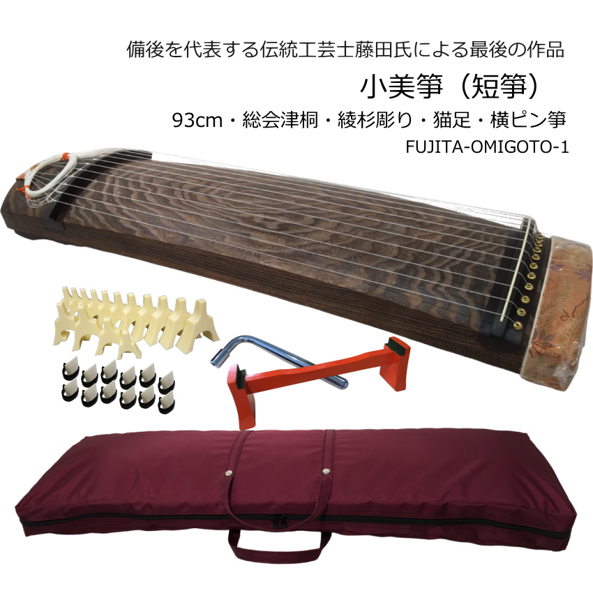 全音が全長80〜90cmほどの小さなお箏(羽衣)を発売した頃から一般的になった短箏ですが、お筝の国内生産の8割以上を担うお筝の町福山市でも以前から短箏はつくられておりました。 当店でもミニ琴教室をはじめ、当店オリジナルの短箏という位置づけて市内の伝統工芸士藤田氏に依頼して高級ミニ和箏「小美箏(おみごと)」を発売致しました。 本商品は、伝統工芸士 藤田氏によって作成された全長93cmの横ピン箏です。 藤田氏のお箏は、特に材に拘っておられ会津桐をご自身で買付けに行き、気に入った材があれば大量に購入して数年寝かせてからお筝に使用されておられます。 面の画像をご覧頂くと、恐らく善し悪しがあまり分からない方でも良い素材なのではないかと想像出来るほど、特に貴重な素材でつくられたお箏です。 猫足や綾杉彫りなど一般的なお箏にも見られる高級お箏の証明のような細工も施されて居ります。 残念ながら藤田氏は引退されますので、もう新たなお箏を作られることはありません。 その様な意味でも、大変貴重なお箏です。 ■出荷前検品について ご注文頂いた後に、当店で試奏検品致しております。 ピン箏は、ご自身で調弦出来る点が特長ではございますが、糸の張り具合が通常の調弦の状態からかけ離れている場合は、調整が大変ですので、出荷前に当店で調弦を行い試奏することで、お手元に到着したら琴柱を立てるだけで演奏が出来る状態となるよう心がけております。 なお、当店で行う調弦は平調子です。文化箏は最初の調弦がドレミ音階から紹介されている教則本もございますが、当店ではあえて最もなじみ深いお箏らしい音階で調弦を行ってから出荷を致して居ります。 ※琴柱は外した状態でお届けいたします。 琴柱を立てて出荷をご希望頂く事もございますが、運送中の振動で必ず琴柱は倒れますので、琴柱は外して発送させて頂きます。予めご了承ください。 ■予めご了承ください。 当店は複数のモールで販売致しておりますので、稀にご注文が重なる場合がございます。 その場合は、他の面をお選びいただくかご注文のキャンセルを承ることとなります。 ■お箏は、全く傷の無い物は稀で何処かしら必ず傷がございます。 細かい仕上げを気になさる場合は、必ず現物をご確認いただいてご納得いく商品をご購入下さい。 大変恐れ入りますが、こちらは大変貴重な商品です。気に入らない部分があれば、「キャンセルや返品をすればよい。」という軽いお気持ちでのご注文はくれぐれもお控えください。 何卒宜しくお願い致します。 |