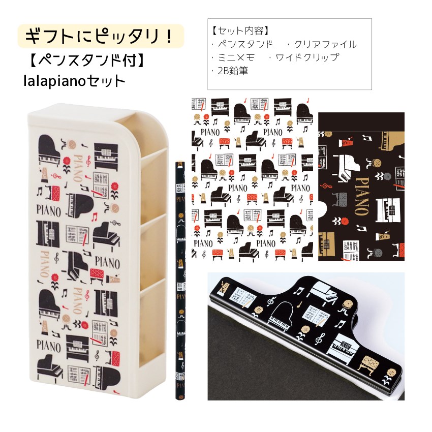 ピアノ教室 や その他 音楽教室の生徒さんや お友達同士のプレゼント交換など様々な場面でご利用頂ける ギフトにピッタリのお得な 文房具セット です(^^♪ ◆セット内容 ① lalaPIANO スリムペンスタンド ② lalaPIANO クリアファイル ③ lalaPIANO ミニメモ ④ lalaPIANO ワイドクリップ ⑤ lalaPIANO 2B鉛筆 ●お勧めのご使用パターン ・お友達へのプレゼント ・生徒さんへのプレゼント ・お誕生日プレゼント ・クリスマスプレゼント ・入学・卒園・卒業等の記念に ・プレゼント交換 ・発表会の記念品として ・レッスン用 ・通学用 ・ご自宅用 ・ピアノ教室の先生へのプレゼント ・吹奏楽部 ・楽団 ・ブラスバンド ●あらかじめご了承下さい ・商品の写真は、撮影の状況やご使用のパソコン、モニター等により 実際の色合いと若干異なる場合がございます。 ・記載しております、サイズ・重量は測定方法により若干異なる場合がございます。 ・生産時期・再入荷により、予告なくデザインの仕様カラーの色味、 素材が変更される場合がございます。 | |