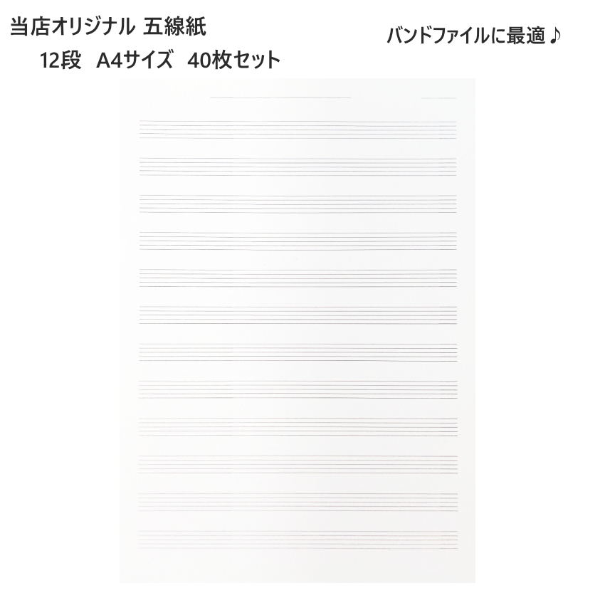 | 当店オリジナル A4判の五線紙です。バンドファイルにピッタリサイズ! バンドファイルにシュッと入れられるので、ストレスなくすぐに譜面が書き込めます(^^)/ 市販されているものは、A4サイズよりちょっと大きいものが多く、バンドファイルに入れようと思うと・・・ 切ったり折り曲げたり・・・ひと手間がかかります(--;) そこで、バンドファイルを使ってきたスタッフにヒヤリングし、バンドファイルに最適な五線紙をオリジナルで製作しました! サイズはピシッとA4サイズ。 紙質はコピー用紙より少し厚めの上質紙。適度な厚みがあり書き込みしやすいです。 五線の色や濃さ、間隔や上下の空きスペースなど、こだわって作りました。 ご使用になられて、『ここがこうだったらもっといいなぁ〜』がありましたら、ご連絡いただけるとうれしいです(^^) 個々で使い勝手があると思いますので、全てをお聞き入れすることは難しいかもしれませんが、より使い勝手のよい五線紙を作るため、 次回製作の際に検討させていただきます。 本商品は片面、40枚入りです。 |