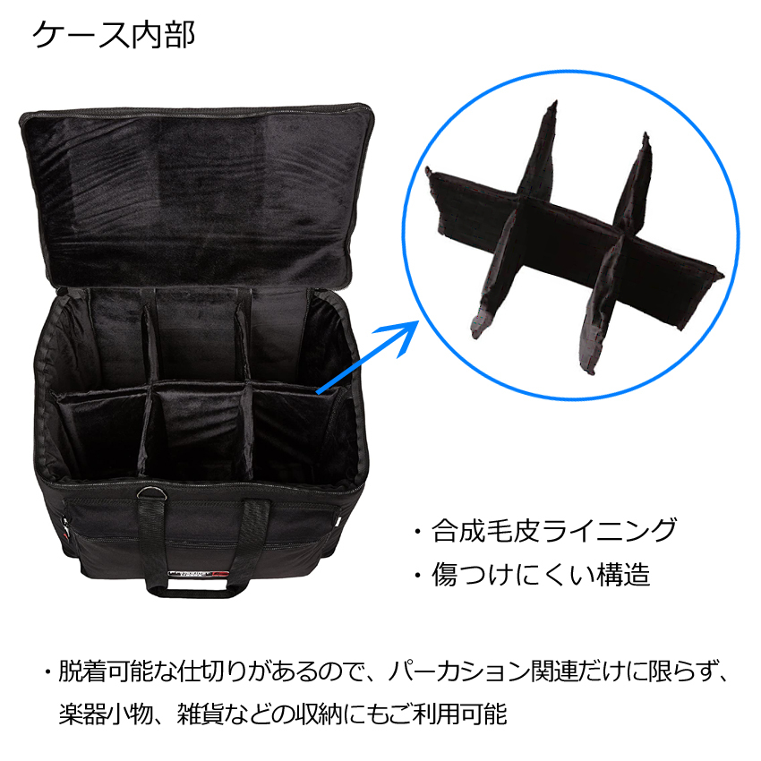 | ・GP-40 ・パーカッション&照明用ケース ・19×12.5×12.5インチ ・「ケース内部」長さ:48.3cm、高さ:31.8cm、幅:31.8cm(内寸) ・「外側ポケット」長さ:40.0cm、高さ:2.5cm、幅:23.0cm(内寸) ・ナイロン製(600デニール) ・厚さ20mmのパッド付き ・保護ファー付き ・折りたたみコンパクト設計 ・手持ちストラップ付き ・取り外し可能ショルダーストラップ付き ・取り外し可能間仕切り付き ・小物収納ポケット付き | ||||||||||||||||||||||