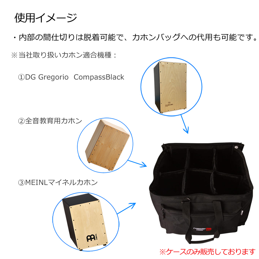 | こちらの19×12.5×12.5インチのGP40はソフトケースですが、600デニールのナイロン製で裏地に厚さ20mmのパッドが入っているので、しっかり楽器を守ってくれます。ケースの内側には保護ファーもついており、自宅やスタジオはもちろん、屋外でも安心して使うことができます。 ケース内部には取り外し可能な間仕切りが入っているので、区切って細かいものを入れたり、間仕切りを外して大きめのものをいれたり・・・ご自身にあった使い方ができます。 間仕切りを外してカホンケースとしての代用も可能です。 (〇適合機種 DeGregorio CAJON 型番:Compass、全音教育用カホン 型番:ZCJ-10、MEINEL マイネルカホン 型番:MCAJ100BK-MA) GP40には手持ちストラップだけでなく、取り外しが可能なショルダーストラップもついているので重い荷物も持ち運びやすくなっています。 ケース本体はコンパクトに折りたたんで収納することができるので、楽器を出した後でもかさばらず置く場所に困らないのも嬉しいポイントです。 また、ケース側面には小物やアクセサリーを収納できるポケットがついているのでとても便利です。 | ||||||||||||||||||||||