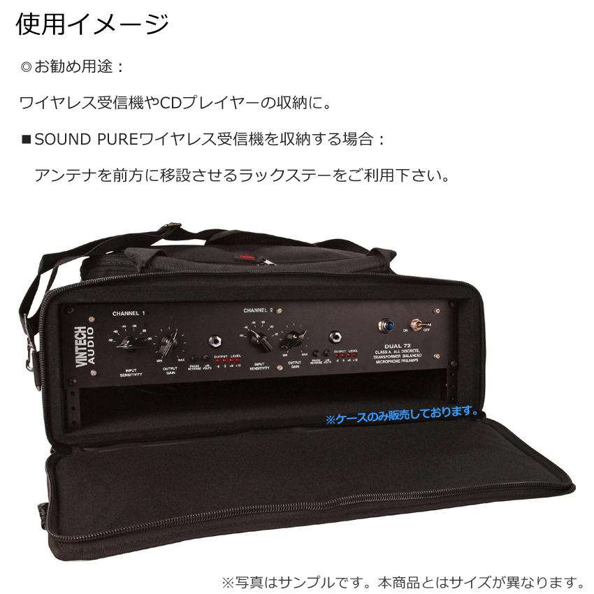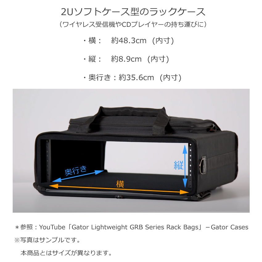 | 本商品GRB-2Uはワイヤレス受信機やCDプレイヤー、オーディオ類などの持ち運びに便利なケースです。 耐久性のあるナイロンでできたケースの内部には厚さ9mmの板がついているため、機材をしっかりと守ってくれ、スタジオや屋外でも安心して使用することができます。 〇ハンドル 手持ちハンドルとショルダーストラップ付きで、それぞれに厚みのあるパッドが入っているので持ち運びやすいです。 〇特長 ケース上部と底面には両開きタイプのファスナーがついており蓋部分を大きく開くことができ、機材を出し入れしやすい構造になっています。 ケース内部にはラックレールが両サイドにあり、付属のネジを使って機材を固定することができます。 ケース底面にはゴム製の脚が4つついているので、ケースを立てた状態でも安定するのがポイントです。 また、ケース正面には内部にマジックテープがついた小物入れもあるので、ケーブルやアクセサリーの収納に大変便利です。 | ||||||||||||||