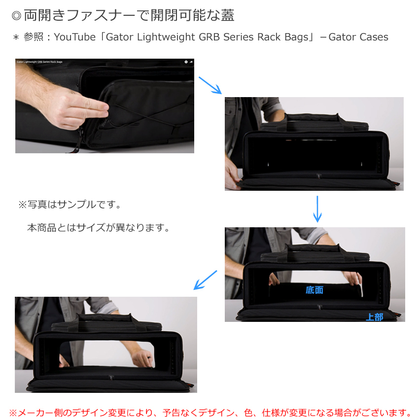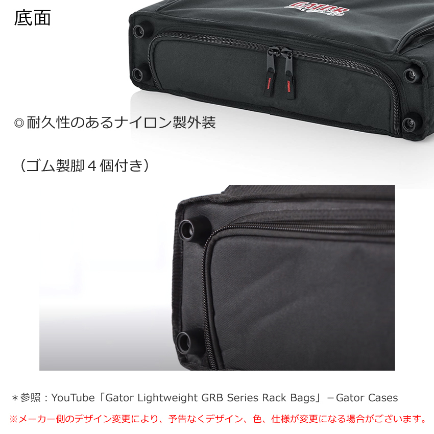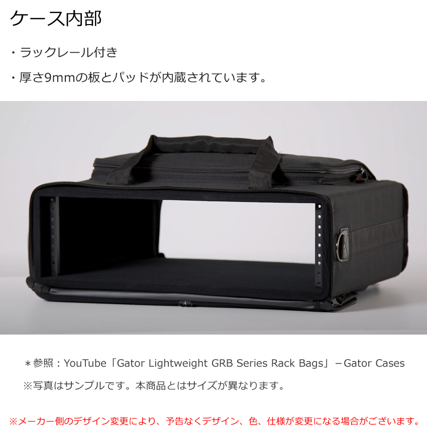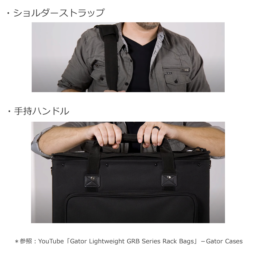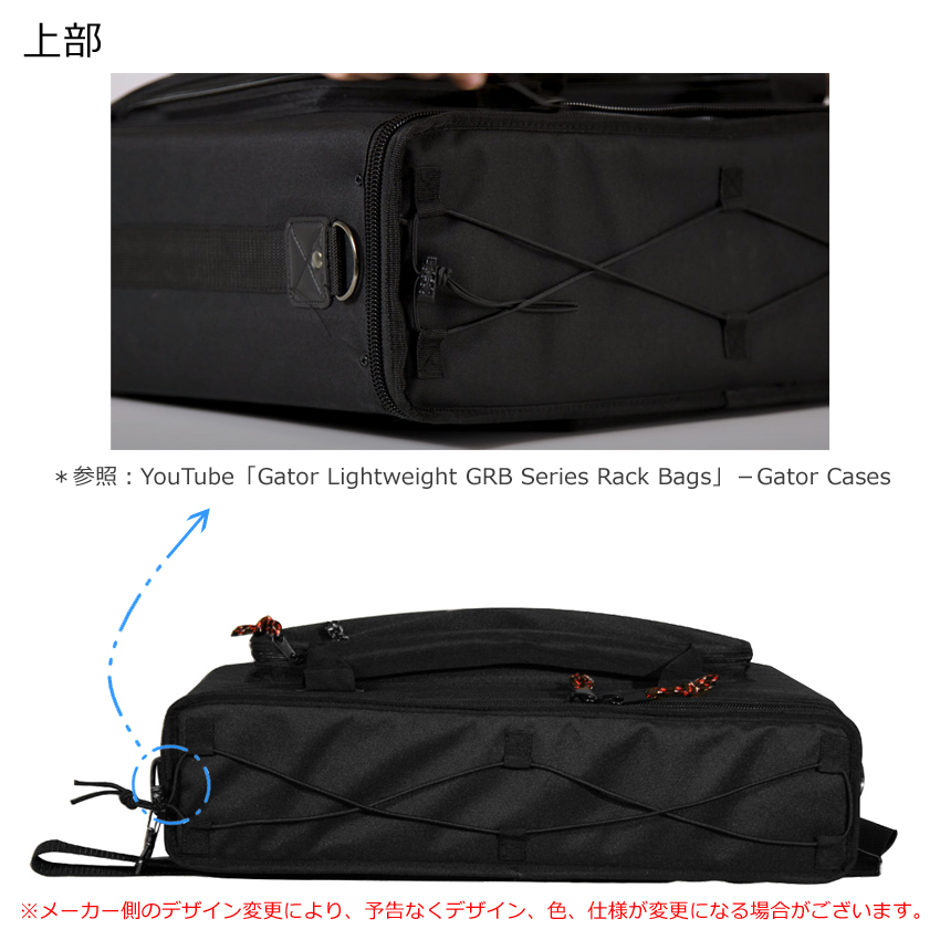 | ・GRB-2U ・ラックバッグ ●サイズ(内寸) ・横:約48.3cm、縦:約8.9cm、奥行き:約35.6cm ・手持ちハンドル(パッド入り) ・ショルダーストラップ付き(パッド入り) ・耐久性のあるナイロン製外装 ・厚さ9mmの板内蔵 ・両開きタイプファスナー ・ラックレール付き ・ゴム製脚付き×4 ・小物入れ付き(内部にマジックテープあり) | ||||||||||||||