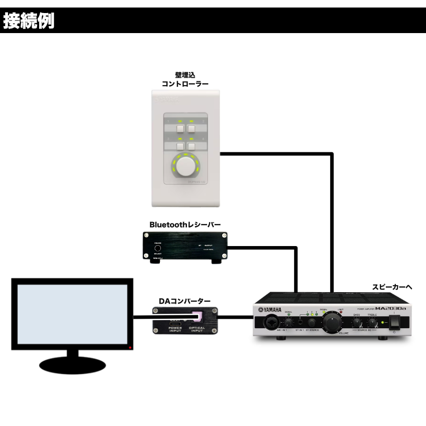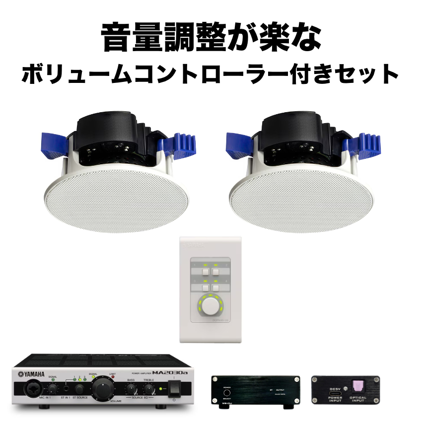 | 【セット内容】YAMAHA 開放型天井埋込スピーカー ×2/DAコンバーター×1/Bluetoothレシーバー×1/ミキシングアンプ×1/リモートコントロールユニット(壁付け用)×1/接続用音声ケーブル×2 | ||||||||||||