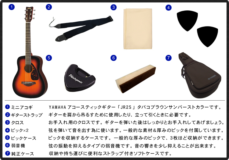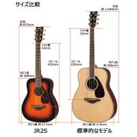 YAMAHAのミニアコースティックギター「JR2S」です。 ヤマハの定番アコースティックギター「FGシリーズ」をモチーフにした、スティール弦のミニフォークギター。一般的なアコースティックギターの全長約1,020mmに比べ、全長約857mmとコンパクトサイズで、小学生位のお子様向けの入門用ギターとしておすすめのモデルです。 ボディ材は、トップ材に輪郭のハッキリしたサウンドが特徴の「スプルース単板」、サイド&バック材にはクセのないサウンドが特徴の「メランティ(マホガニー柄)」を採用。また、レギュラーサイズのアコースティックギターと同様に、表板に僅かなアーチを付けることによって、コンパクトなサイズながら適度なテンション感と広がりのあるサウンドを獲得しています。また、側裏板には艶あり塗装、ヘッドにはローズウッドの化粧貼りを施す等、高級感のある仕上げになっています。 スケール(弦長)は、標準サイズのギター(約650mm)に比べて約110mmほど短い540mmとなっていますので、お子様の練習用のギターとして最適です。また、ナット幅が通常のギターと同じ43mmとなっていますので大人の方はもちろん お子様が成長されても違和感なく持ち替えが可能です。 また、トラベルギターや気軽に弾ける セカンドギターとしてもおすすめです。