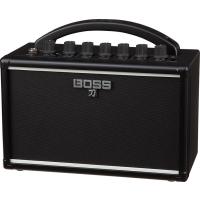 | BOSSのコンボギターアンプ「KATANA-MINI」です。 本格的なサウンドをポータブルサイズに凝縮したバッテリー駆動アンプ。本格的なステージクラスのアンプと同じように、段階的にゲインアップしていきダイナミックで表現力豊かな歪みを生み出すアナログゲイン回路と、単純なEQではなくビンテージアンプの回路と同じ3バンドトーンスタック、温かみのある残響音が特徴のディレイを搭載。クラスを超えた音作りと弾く楽しさが味わえるミニアンプです。 最高のサウンドを最小限のアンプで得るための専用デザイン 「KATANA-MINI」は上位クラスのアンプを単純に小型化するのではなく、クラスを超えたサウンドを実現するために専用設計/開発。4インチ(10cm)のカスタム・スピーカー、サイズや重量だけでなく音質を追求したハードウェア、本格的なステージ・アンプと同様の洗練された回路、ミニサイズでも箱鳴りを追求したキャビネット・デザイン、全てをコンパクトな筐体に凝縮し、「KATANA」アンプのロック・サウンドを実現しています。また、BOSSが長年開発してきたバッテリー駆動アンプの省電力技術により、単三電池6本で驚くべきパワーとパンチのあるサウンドを実現しています。 研ぎ澄まされた本格的なロック・サウンド ライブ・ステージで使用する大型のギター・アンプと同様に、しっかりとしたクリーンをベースに段階的にゲインをアップさせて歪みを生み出すアナログ・ゲイン回路を搭載しています。歪みやサウンド・キャラクターがギターのボリュームやピッキングのニュアンスに反応して変わるため、表現力豊かなサウンドが得られます。搭載されているアンプ・タイプは、世界のトップ・ギタリストが求めるBOSSのフラッグシップ・モデル「WAZA AMP」ゆずりの洗練されたハイゲイン・サウンドが得られる「BROWN」に加え、ロックのコード・ストロークやブルースのリード・プレイに最適なドライブ・サウンドが得られる「CRUNCH」、ダイナミック・レンジが広く、鮮明で芯のあるトーンが得られる「CLEAN」の3タイプです。 伝統的な3バンド・トーンスタックと内蔵ディレイ ミニ・アンプには単純なEQで音作りをするものが多いですが、KATANA-MINIには本格的な3バンドのアナログ・トーン・スタック回路が搭載されています。フルサイズのアンプと同じように、各つまみ位置により歪みと複雑に連動してサウンド・キャラクターを変化させ、自然な音色作りが可能です。また、温かみのある音が特長のテープ・エコー・タイプのディレイも搭載しており、タイムとエフェクト・レベルのシンプルなコントロールにより、リバーブのような使い方から、ロング・ディレイまで幅広い演出が可能です。 自宅から屋外まで、どこでもロック・サウンドを 非常に軽量・コンパクトで電池駆動が可能なので、置く場所を選びません。自宅のテーブルや棚に置いて本格的なロック・サウンドを楽しむだけでなく、握りやすいハンドルで気軽に屋外へ持ち出すことも可能です。AUX IN端子にスマートフォンやオーディオ・プレイヤーを接続すると、お気に入りの曲に合わせて演奏を楽しむことができます。さらに、PHONES/REC OUT端子からは、実際にマイクで録音したかのような迫力あるサウンドが得られるため、ヘッドホンによる深夜の練習やレコーディングにも活用できます。