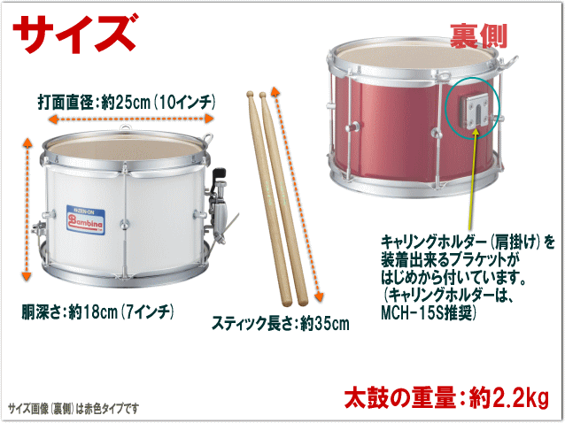 パールより別売されているマーチングキャリングホルダー(肩に掛けてドラムを腰の辺りに固定するホルダー)を使えば本格的なマーチングバンドや行進などに使えます。マーチングの演奏の活動や発表の場も広がります。(推奨キャリングホルダー:パール MCH-15S)別売。