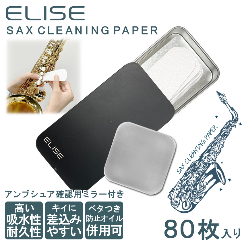 ELISE エリース サックス用 クリーニングペーパー 80枚入り 専用スライドケース/アンブシュア確認用 小型ミラー付き / Black ブラック / メール便対応 3点まで