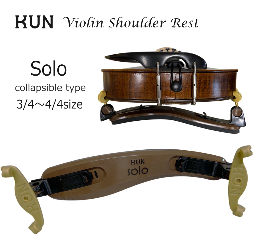 肩当ての定番ブランドKUN(クン)には様々なタイプがございますが、Soloは製作に2年も要して生み出したフラッグシップ的な機種です。 Solo(ソロ)は、脚部が折りたためるCollapsibleタイプです。 ベースを含め、脚部の高さが他の機種よりも高く調整いただけますので、特に肩と顎の挟む部分で厚みが欲しいという演奏者に人気のです。 ■特長1 脚部の幅の調整方法。 従来、脚部の幅を調整するパーツの固定はネジですが、指で素早く調整できるレバーに変更されております。 これにより、ネジ穴間隔でしか調整できなかった他の機種と比べ、超微細な幅の調整が可能となりました。 ■特長2 パットの形状に安定感。 パットは、肩に乗せる方が幅が広くなっていて、パットに切り抜き模様が施されており、滑りにくく演奏時に安定感があります。 その他、ドラムを奥まらせて統合する新しい折りたたみ方式によって、肩当ての「足」部分が簡単に折りたためて保管に便利です。 ■脚部が折りたためる2機種を比較 SoloはCollapsibleタイプです。KUNの脚部が折りたためる機種の代表機種「Collapsible」と「Solo」を比較してみました。Restのアールは同形状ですがパット部がSoloの方が広く切り込みを入れている分滑り難く演奏中に安定感があります。 |