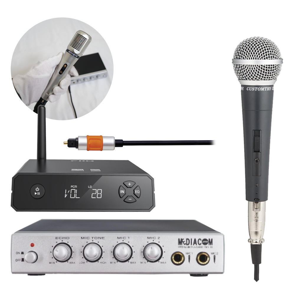 【ミキサーの特長】 シンプルで簡単に使えるカラオケ専用ミキサーです。マイク入力の無いアクティブスピーカーやコンポからマイクの音を出すことができます。 パソコンやゲーム機、テレビの音声出力端子をミキサーに繋げば、マイクの音と同時に出力することも。入力はアナログのみ対応となりますが、変換器を使えばHDMIや光デジタルの音声も入力可能。当店では変換器とのセット商品もご用意しております!