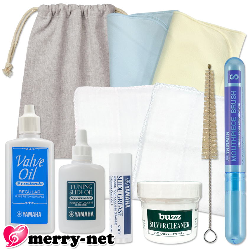 銀メッキ仕上げのトランペット用 お手入れセット ヤマハのオイル2種類 グリス / 磨き傷が入りにくい楽器に優しいクリーナー&クロス2枚付き / 吹奏楽部 初心者