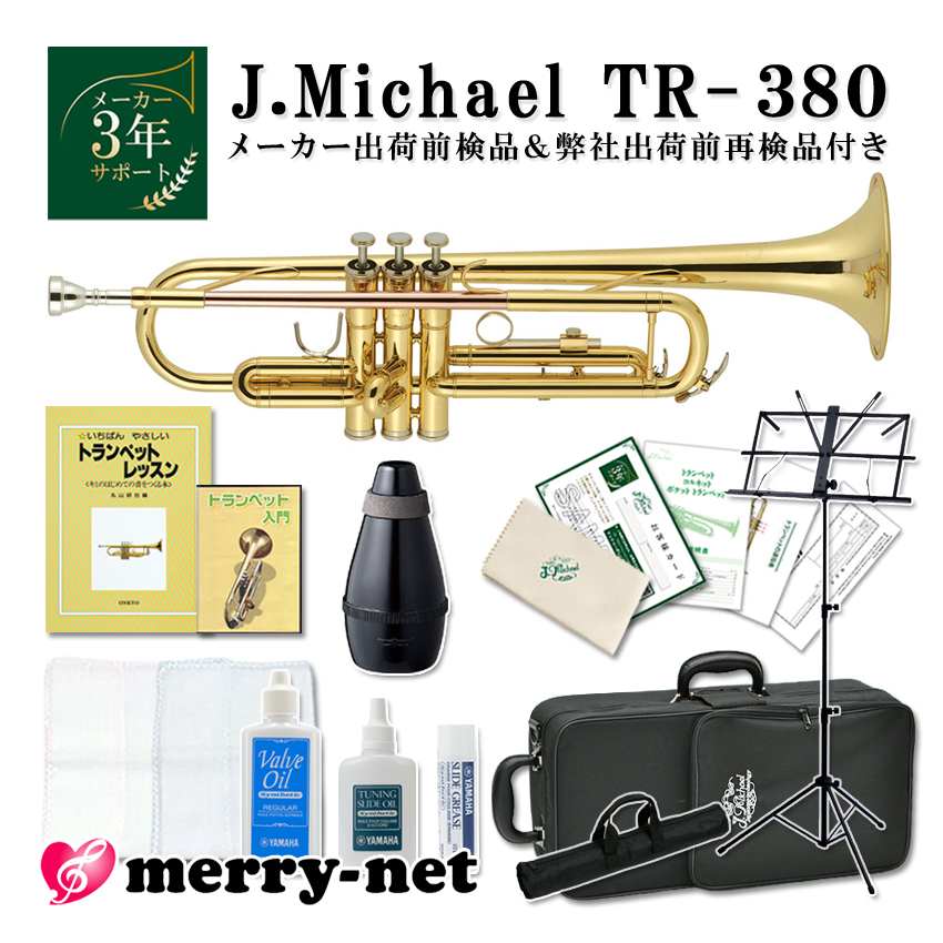 | マックコーポレーション株式会社販売の、J.Michael トランペット TR-380です。 【J.Michaelについて】 J.Michaelは、マックコーポレーション株式会社の管楽器専門スタッフが製品の開発に携わり、これまで培ってきたノウハウとプロ奏者との対話から生まれる意見をもとに改良を重ねており、低価格ながら高品質の楽器を実現しております。 そのコストパフォーマンスの高さから、日本だけでなく海外の代理店にも輸出されており、世界中のプレーヤーにご愛用いただいております。 【こんな方へおすすめ!】 ・お子様のはじめての楽器として ・続ける自信はないけど、チャレンジしてみたい ・また趣味として久しぶりに吹いてみたい ・小学生以下のクラブ活動(鼓笛隊・ブラスバンド)で自分の楽器を持たせたい ・ちょっとした遊び感覚で他の楽器を吹いてみたい金管奏者の方 【セットの内容について】 教則本と教則DVD、お手入れ用品の付いたセットとなっております。 本とDVDはそれぞれに沿った内容となっているので、文字と映像・音声で確認をしながら練習することが出来ます。 楽器の持ち方から音の出し方や、お手入れの方法も収録されています。 身近に教われる環境が無い方や、時間がなくてレッスンに通えない方でも、独学で練習することが出来ます。 お手入れ用品は、トランペットのお手入れに必要最低限の内容をお付けしております。 チューニングスライドオイルは、他店のセットや他メーカーのお手入れセットには、なぜか含まれていないことが大半なのですが、トランぺットのお手入れには欠かせません。 きちんとオイルを点さずに使用していると、摩擦で管が削れてしまったり、サビを起こしてしまいます。 安価な楽器ではありますが、楽器は靴と同じように使えば使うほど自分に合った楽器になっていきます。 高価な楽器と比較すると耐久性に劣る部分もございますので、しっかりとしたお手入れを行うことで楽器を長持ちさせることが出来ます。 ミュートは、あまり大きな音を出して練習できないな、という時に音量を抑えるために使用します。 ※ミュートを付けた状態での練習は、吹き方にも楽器にも悪いクセがつくので、つけっぱなしでのおすすめ致しません。 譜面台は教則本などを置いて使用します。 机に広げて置いても良いのですが、机に置いた教則本を見ようと思うと顔や視線も下向きになり、背中が丸まってしまいます。 管楽器の演奏において息というものは非常に大事なもので、姿勢が悪いと十分に肺に息が入らなくなったり、吹き方に悪いクセが付いてしまいます。 譜面台を使えば、良い姿勢を保って演奏できる高さに調節することが出来ます。 【試奏した感想&TR-200との比較】 TR-380はクリアラッカー仕上げのため、少し暗めの締りのある音色がします。 中国製の楽器、ということでピストンが全然動かないのでは?と思っていましたが、 メロディーラインや極端に早いパッセージでなければついてこれるので、 趣味やこれから楽器をはじめてみようかな、という方には充分なパフォーマンスだと思います。 マウスパイプがレッドブラス仕上げのため、TR-200よりも響きが豊かで鳴らしやすいと感じました。 また、3番抜差管が可動式なので、自分の手の大きさに合わせて調節することができ、持ちやすいです。 2機種ともに違いはございますが、非常に大きな差があるというわけではないので、 続ける自信があんまりないな、ちょっとした遊び感覚で吹いてみたいなという方は、TR-200 予算にすこし余裕がある、少しでも吹きやすいほうが良いなという方は、TR-380という感じでお選び頂ければよいと思います。 | ||||||||||
