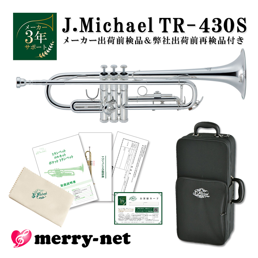 | マックコーポレーション株式会社販売の、J.Michael トランペット TR-430Sです。 【J.Michaelについて】 J.Michaelは、マックコーポレーション株式会社の管楽器専門スタッフが製品の開発に携わり、これまで培ってきたノウハウとプロ奏者との対話から生まれる意見をもとに改良を重ねており、低価格ながら高品質の楽器を実現しております。 そのコストパフォーマンスの高さから、日本だけでなく海外の代理店にも輸出されており、世界中のプレーヤーにご愛用いただいております。 【こんな方へおすすめ!】 ・お子様のはじめての楽器として ・続ける自信はないけど、チャレンジしてみたい ・また趣味として久しぶりに吹いてみたい ・小学生以下のクラブ活動(鼓笛隊・ブラスバンド)で自分の楽器を持たせたい ・ちょっとした遊び感覚で他の楽器を吹いてみたい金管奏者の方 【試奏した感想&TR-300Sとの比較】 TR-430Sは銀メッキ仕上げのため、クリアラッカー仕上げと比べて音が柔らかいです。 中国製の楽器、ということでピストンが全然動かないのでは?と思っていましたが、 メロディーラインや極端に早いパッセージでなければついてこれるので、 趣味やこれから楽器をはじめてみようかな、という方には充分なパフォーマンスだと思います。 マウスパイプがレッドブラス仕上げのため、TR-300Sよりも響きが豊かで鳴らしやすいと感じました。 また、3番抜差管が可動式なので、自分の手の大きさに合わせて調節することができ、持ちやすいです。 2機種ともに違いはございますが、非常に大きな差があるというわけではないので、 続ける自信があんまりないな、ちょっとした遊び感覚で吹いてみたいなという方は、TR-300S 予算にすこし余裕がある、少しでも吹きやすいほうが良いなという方は、TR-430Sという感じでお選び頂ければよいと思います。 | ||||||||||