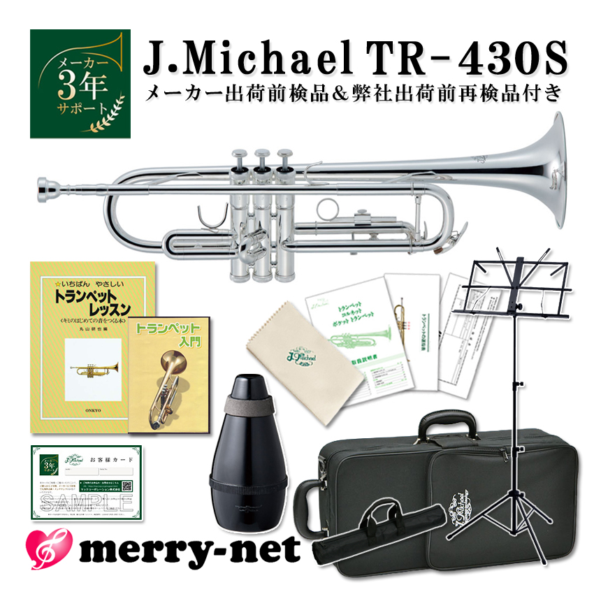 | マックコーポレーション株式会社販売の、J.Michael トランペット TR-430Sです。 【J.Michaelについて】 J.Michaelは、マックコーポレーション株式会社の管楽器専門スタッフが製品の開発に携わり、これまで培ってきたノウハウとプロ奏者との対話から生まれる意見をもとに改良を重ねており、低価格ながら高品質の楽器を実現しております。 そのコストパフォーマンスの高さから、日本だけでなく海外の代理店にも輸出されており、世界中のプレーヤーにご愛用いただいております。 【こんな方へおすすめ!】 ・お子様のはじめての楽器として ・続ける自信はないけど、チャレンジしてみたい ・また趣味として久しぶりに吹いてみたい ・小学生以下のクラブ活動(鼓笛隊・ブラスバンド)で自分の楽器を持たせたい ・ちょっとした遊び感覚で他の楽器を吹いてみたい金管奏者の方 【セットの内容について】 教則本と教則DVD、ミュートと譜面台の付いたセットとなっております。 本とDVDはそれぞれに沿った内容となっているので、文字と映像・音声で確認をしながら練習することが出来ます。 楽器の持ち方から音の出し方や、お手入れの方法も収録されています。 身近に教われる環境が無い方や、時間がなくてレッスンに通えない方でも、独学で練習することが出来ます。 ミュートは、あまり大きな音を出して練習できないな、という時に音量を抑えるために使用します。 ※ミュートを付けた状態での練習は、吹き方にも楽器にも悪いクセがつくので、つけっぱなしでのおすすめ致しません。 譜面台は教則本などを置いて使用します。 机に広げて置いても良いのですが、机に置いた教則本を見ようと思うと顔や視線も下向きになり、背中が丸まってしまいます。 管楽器の演奏において息というものは非常に大事なもので、姿勢が悪いと十分に肺に息が入らなくなったり、吹き方に悪いクセが付いてしまいます。 譜面台を使えば、良い姿勢を保って演奏できる高さに調節することが出来ます。 【試奏した感想&TR-300Sとの比較】 TR-430Sは銀メッキ仕上げのため、クリアラッカー仕上げと比べて音が柔らかいです。 中国製の楽器、ということでピストンが全然動かないのでは?と思っていましたが、 メロディーラインや極端に早いパッセージでなければついてこれるので、 趣味やこれから楽器をはじめてみようかな、という方には充分なパフォーマンスだと思います。 マウスパイプがレッドブラス仕上げのため、TR-300Sよりも響きが豊かで鳴らしやすいと感じました。 また、3番抜差管が可動式なので、自分の手の大きさに合わせて調節することができ、持ちやすいです。 2機種ともに違いはございますが、非常に大きな差があるというわけではないので、 続ける自信があんまりないな、ちょっとした遊び感覚で吹いてみたいなという方は、TR-300S 予算にすこし余裕がある、少しでも吹きやすいほうが良いなという方は、TR-430Sという感じでお選び頂ければよいと思います。 | ||||||||||