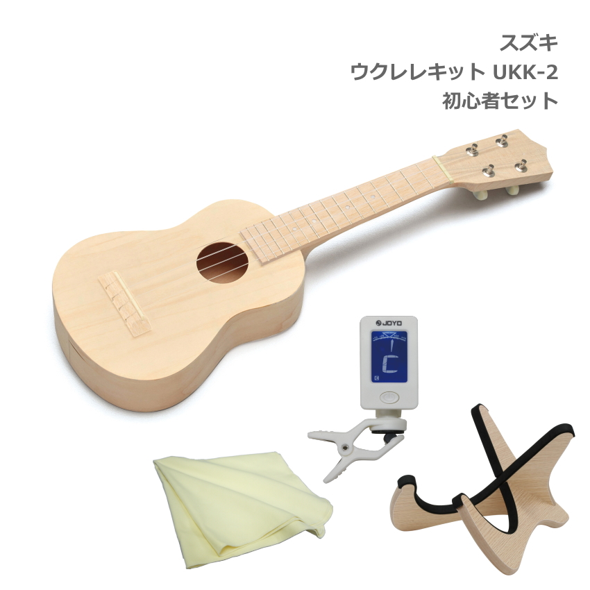 | ウクレレはやわらかくあたたかい音色が癒される、ハワイを代表する楽器です。 サイズもコンパクトで子どもでも弦が押さえやすいため、どなたも手軽に触れられる楽器として、手づくり楽器シリーズの中でも特に人気があります。 シールやマスキングテープ、絵の具、ペンなどを使って、世界に1つだけのウクレレが製作できます。 クリアラッカーやニスで仕上げるとつやが出て塗装がはがれにくくなり、本格的な仕上がりになります。 ウクレレ本体の音を合わせるのに必要なチューナー、お手入れ用のクロス、ウクレレによく合う木目調のウクレレスタンドが付属したセットです。 組み立てたあとは付属の楽譜で演奏を楽しみましょう。 | ||||||||||