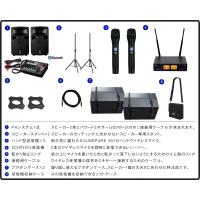 StagePAS400BT(スピーカー2本・パワードミキサー1個・スピーカーケーブル付き)/スピーカースタンド×2/ハンドヘルド型ワイヤレスマイク(H-80112)×2/転がり防止リング×2/2CHワイヤレス受信機/ワイヤレス受信機接続用ケーブル×1/受信機収納用1Uラックケース×1/プラダンケース×2
