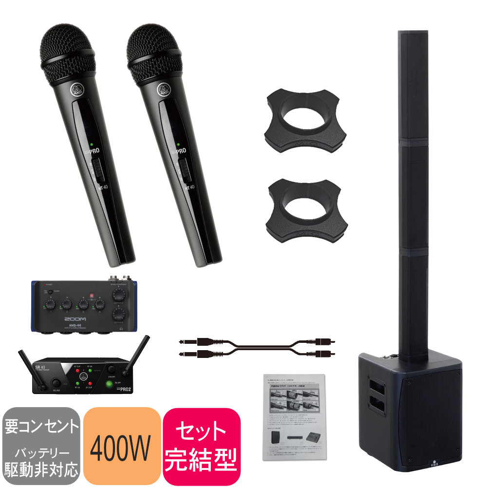 K.W.S 軽量コラムスピーカー/USBオーディオインターフェイス/ワイヤレスハンドマイク×2/2ch受信機×1/各種接続ケーブル/転がり防止リング×2