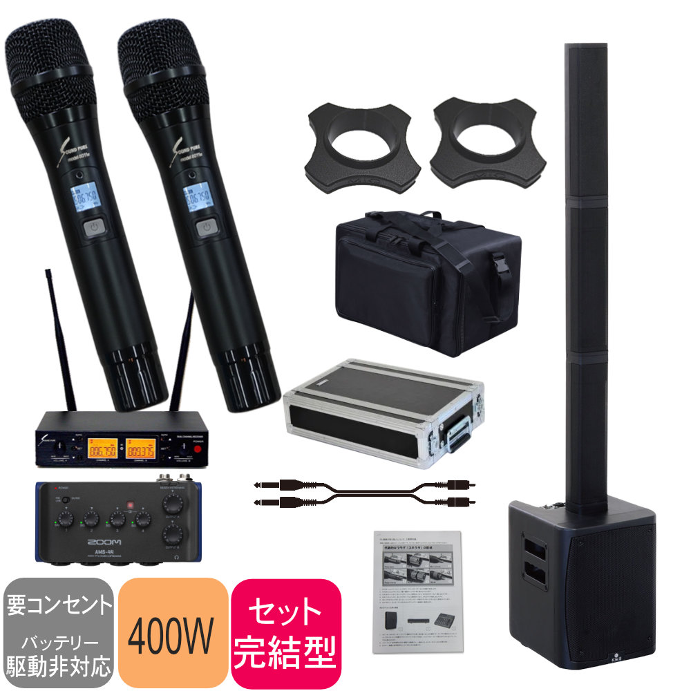 K.W.S 軽量コラムスピーカー/USBオーディオインターフェイス/ワイヤレスマイク×2/2CHワイヤレス受信機×1/各種接続ケーブル/転がり防止リング×2/スピーカー用ソフトケース/ワイヤレス受信機用2Uサイズラックケース