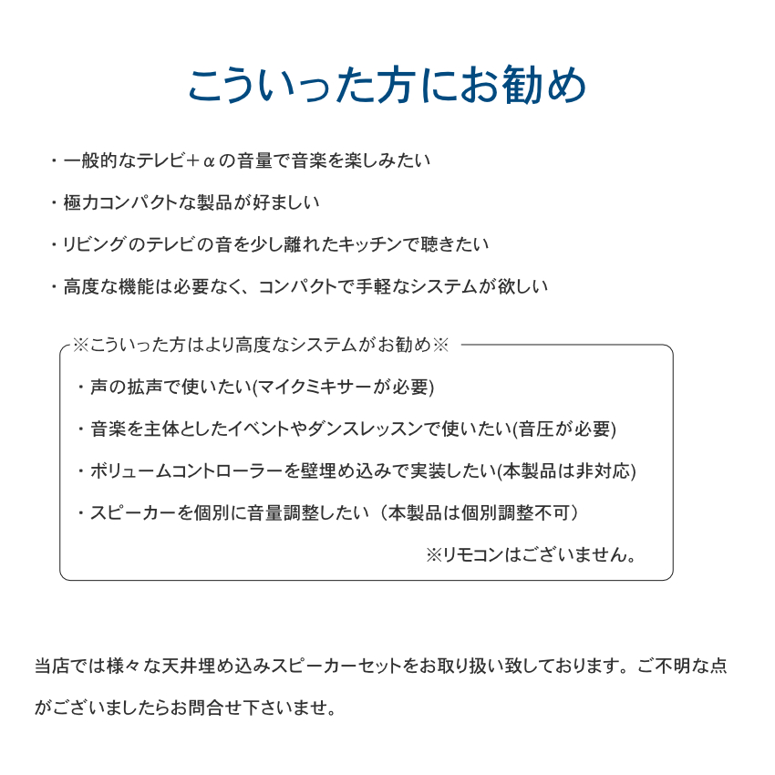 ※こういった方はより高度なシステムがお勧め※ ・声の拡声で使いたい(マイクミキサーが必要) ・音楽を主体としたイベントやダンスレッスンで使いたい(音圧が必要) ・ボリュームコントローラーを壁埋め込みで実装したい(本製品は非対応) ・スピーカーを個別に音量調整したい(本製品は個別調整不可)