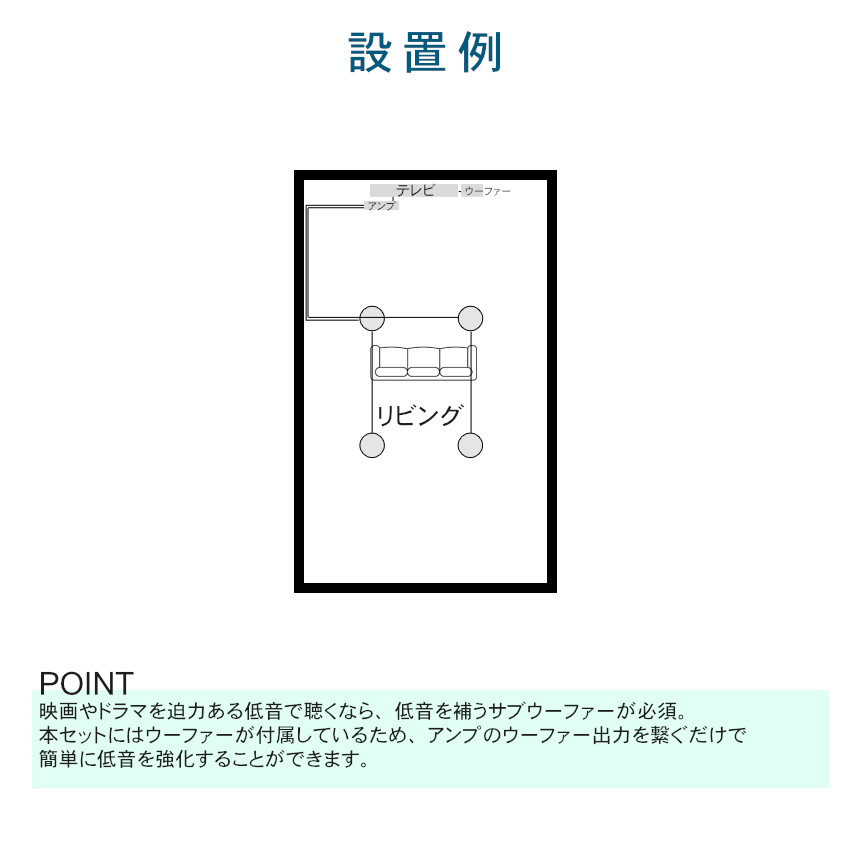 【セットの特長】 サブウーファーを付けてより厚みのあるサウンドが楽しめるウーファー+天井埋込みスピーカーのセットです。商業設備やホームオーディオにぴったり。