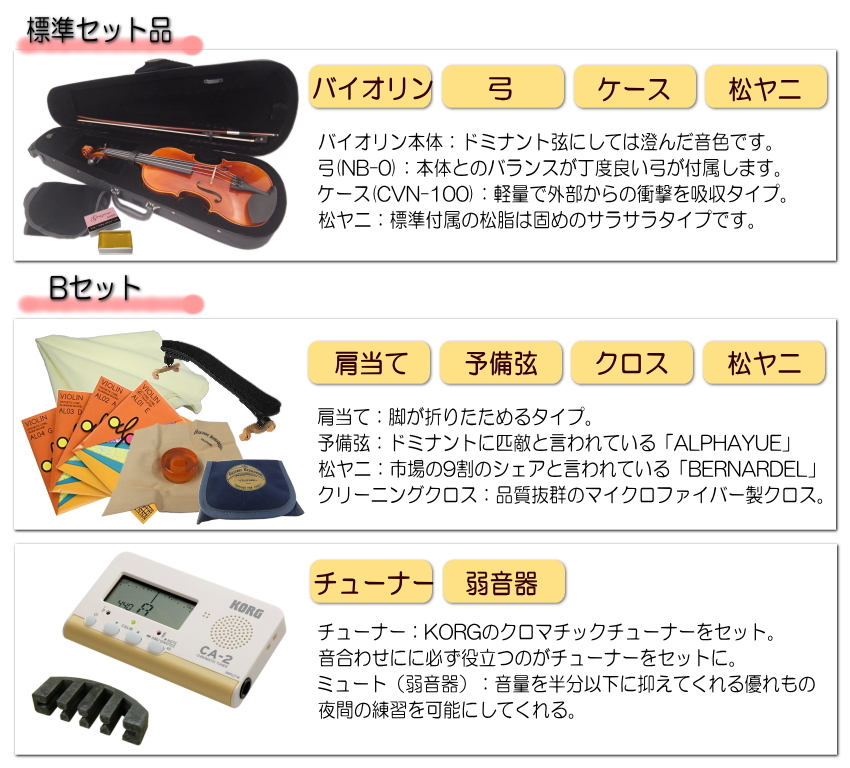 基本セットには、バイオリン本体の他に弓/ケース/松脂が標準の付属品となっております。