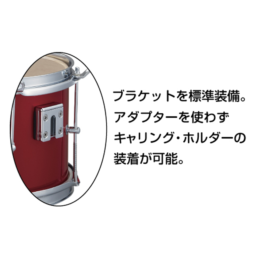 また、これまではキャリングホルダーを取り付ける為には専用の「ブラケット(キャリングホルダーを付けるための受け具)」が別売で、お客様で太鼓の側面に取り付けて頂く負担があったのですが、本モデルからは、最初からブラケットが太鼓に装着されています。この点が一番大きな改良点といえます。