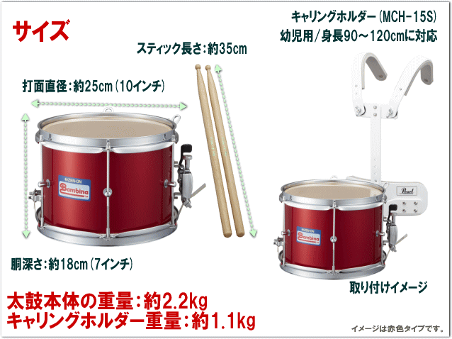 本商品は教育向け楽器も扱うの老舗楽器メーカー、「ゼンオン(全音楽譜出版社)」のバンビーナ、ポピュラーグレードシリーズのマーチングドラムで、幼児向けマーチングドラムの定番といえるモデルです。