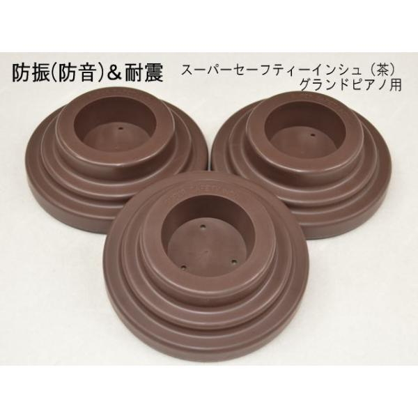 効 果 | 耐震(横滑り防止)、防音(ピアノの音の振動を床に伝えない:防振) | 入り数 | グランドピアノ1台分(インシュレータ3つ) | サイズ | 掲載画像をご参照下さい。 | インシュレータ1個の重さ | 約650g | 色 | 茶色 |