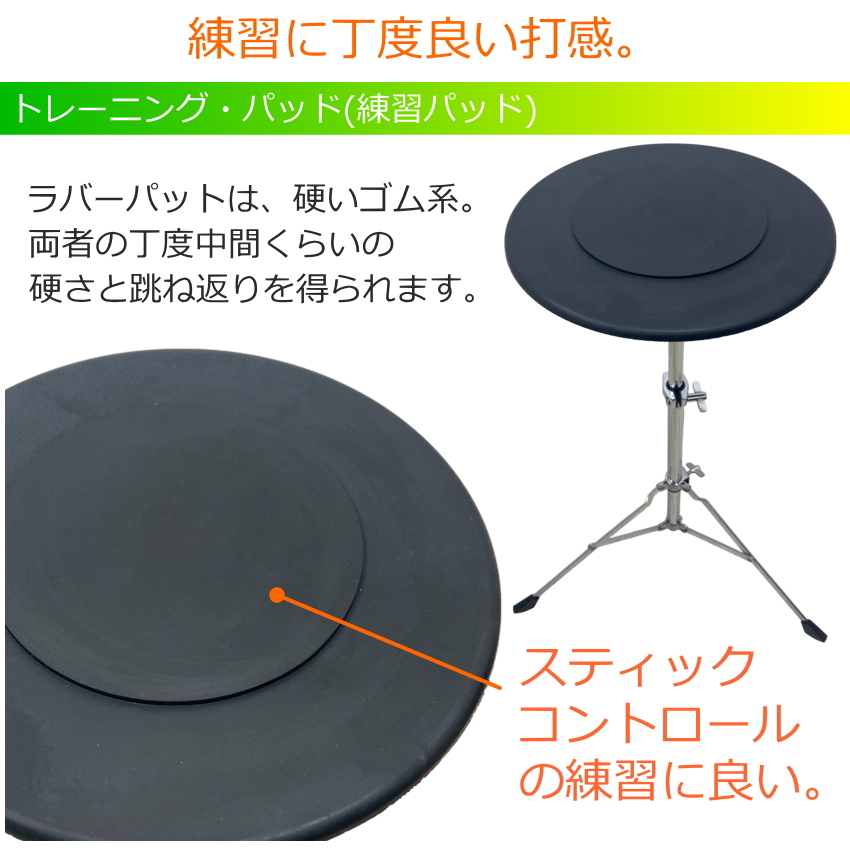 内容は、「直径:10インチ(約25cm)サイズのラバーパッド」と「専用のスタンド」と、シンプルなセットで、場所を取る事無く気軽に練習いただけます。