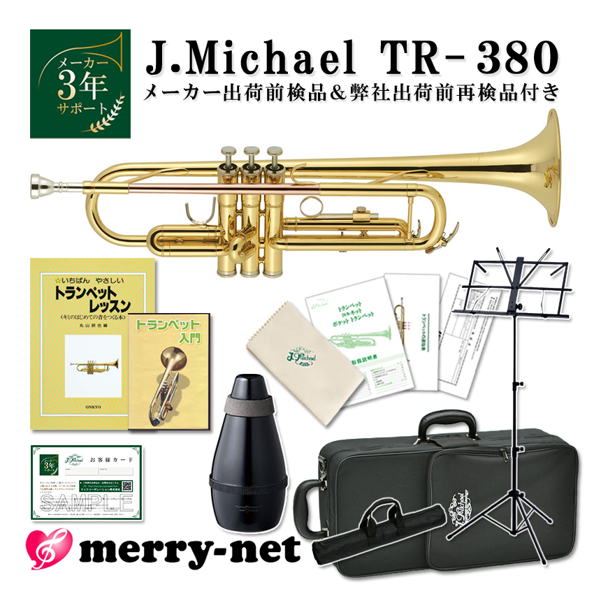 | マックコーポレーション株式会社販売の、J.Michael トランペット TR-380です。 【J.Michaelについて】 J.Michaelは、マックコーポレーション株式会社の管楽器専門スタッフが製品の開発に携わり、これまで培ってきたノウハウとプロ奏者との対話から生まれる意見をもとに改良を重ねており、低価格ながら高品質の楽器を実現しております。 そのコストパフォーマンスの高さから、日本だけでなく海外の代理店にも輸出されており、世界中のプレーヤーにご愛用いただいております。 【こんな方へおすすめ!】 ・お子様のはじめての楽器として ・続ける自信はないけど、チャレンジしてみたい ・また趣味として久しぶりに吹いてみたい ・小学生以下のクラブ活動(鼓笛隊・ブラスバンド)で自分の楽器を持たせたい ・ちょっとした遊び感覚で他の楽器を吹いてみたい金管奏者の方 【セットの内容について】 教則本と教則DVD、ミュートと譜面台の付いたセットとなっております。 本とDVDはそれぞれに沿った内容となっているので、文字と映像・音声で確認をしながら練習することが出来ます。 楽器の持ち方から音の出し方や、お手入れの方法も収録されています。 身近に教われる環境が無い方や、時間がなくてレッスンに通えない方でも、独学で練習することが出来ます。 ミュートは、あまり大きな音を出して練習できないな、という時に音量を抑えるために使用します。 ※ミュートを付けた状態での練習は、吹き方にも楽器にも悪いクセがつくので、つけっぱなしでのおすすめ致しません。 譜面台は教則本などを置いて使用します。 机に広げて置いても良いのですが、机に置いた教則本を見ようと思うと顔や視線も下向きになり、背中が丸まってしまいます。 管楽器の演奏において息というものは非常に大事なもので、姿勢が悪いと十分に肺に息が入らなくなったり、吹き方に悪いクセが付いてしまいます。 譜面台を使えば、良い姿勢を保って演奏できる高さに調節することが出来ます。 【試奏した感想&TR-200との比較】 TR-380はクリアラッカー仕上げのため、少し暗めの締りのある音色がします。 中国製の楽器、ということでピストンが全然動かないのでは?と思っていましたが、 メロディーラインや極端に早いパッセージでなければついてこれるので、 趣味やこれから楽器をはじめてみようかな、という方には充分なパフォーマンスだと思います。 マウスパイプがレッドブラス仕上げのため、TR-200よりも響きが豊かで鳴らしやすいと感じました。 また、3番抜差管が可動式なので、自分の手の大きさに合わせて調節することができ、持ちやすいです。 2機種ともに違いはございますが、非常に大きな差があるというわけではないので、 続ける自信があんまりないな、ちょっとした遊び感覚で吹いてみたいなという方は、TR-200 予算にすこし余裕がある、少しでも吹きやすいほうが良いなという方は、TR-380という感じでお選び頂ければよいと思います。 | ||||||||||