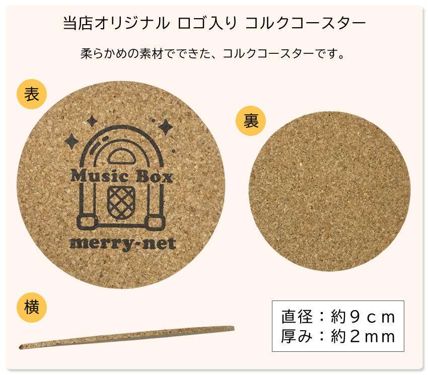 コルクコースターは、真ん中に「ミュージックボックス」が描かれている弊社オリジナル商品です。