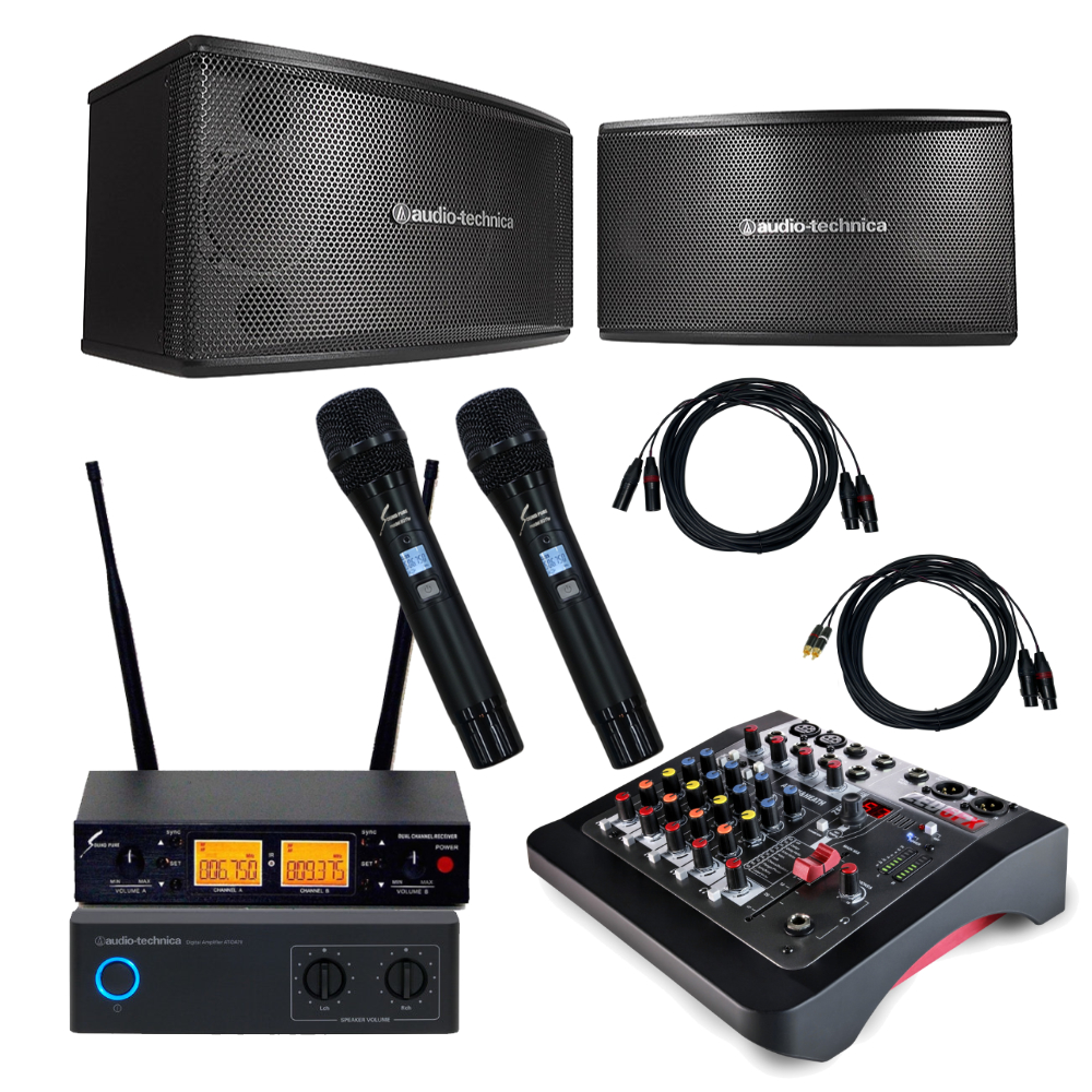 audio-technica カラオケスピーカーセット 音楽スタジオ品質のミキサーセット ワイヤレスマイク2本セット