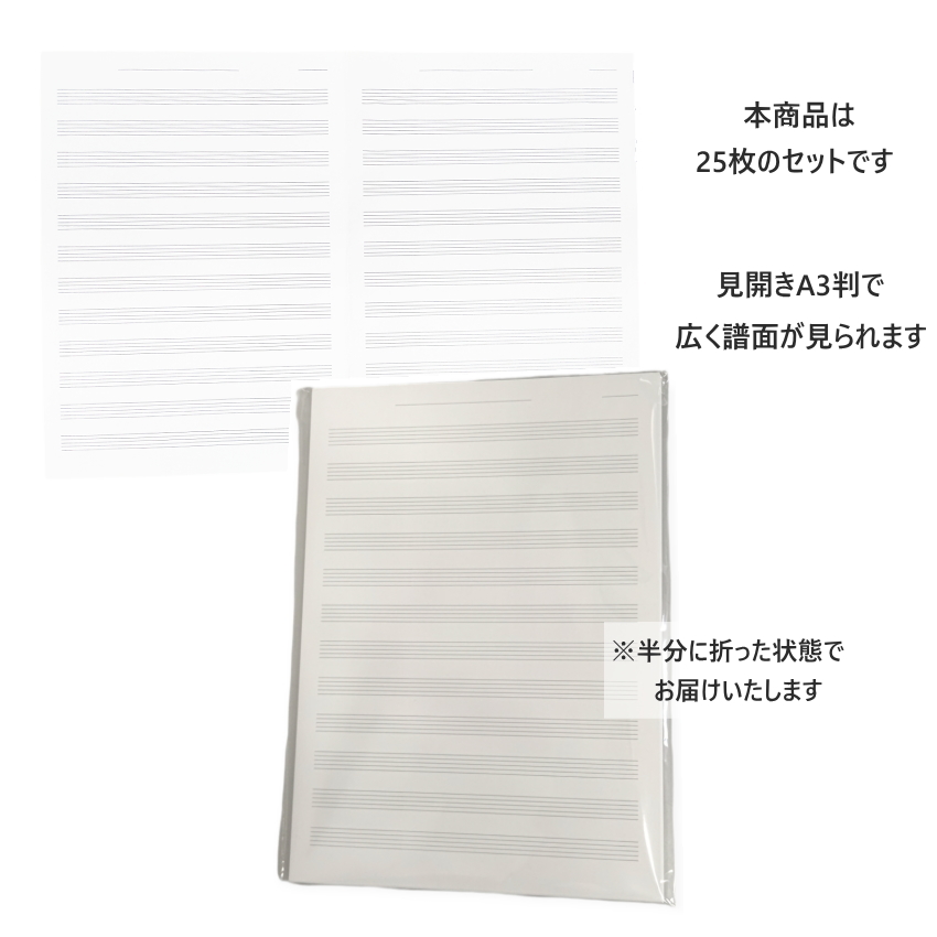 | 当店オリジナル A3判の五線紙です。見開きA3サイズで広く譜面が見られます! 紙質はコピー用紙より少し厚めの上質紙。適度な厚みがあり書き込みしやすいです。 五線の色や濃さ、間隔や上下の空きスペースなど、こだわって作りました。 バンドファイルには半分に折って収納できます。 ご使用になられて、『ここがこうだったらもっといいなぁ〜』がありましたら、ご連絡いただけるとうれしいです(^^) 個々で使い勝手があると思いますので、全てをお聞き入れすることは難しいかもしれませんが、より使い勝手のよい五線紙を作るため、 次回製作の際に検討させていただきます。 本商品は片面、25枚入りです。 |
