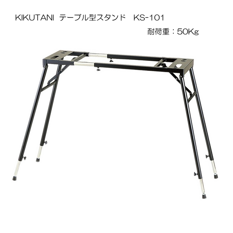 | キーボードや電子ピアノ、また、木琴など大変多くの楽器にご使用いただけるテーブル型スタンドです。 折りたたみ式で収納や持ち運びも便利! ■お勧めのポイント1 テーブル型は、X型スタンドと異なり 椅子に座った時にスタンドの支柱に足が干渉するということがなく、ペダル操作が楽に行えます。 ■お勧めのポイント2 耐荷重が50Kgというのは、同等タイプのスタンドの中で最も耐久性が高いスタンドです。 ■お勧めのポイント3 折りたたみ式なので、脚部を折りたたみ机や棚の隙間などに立て掛けて収納可能です。 ■お勧めのポイント4 脚部の長さはセパレート式(バラバラ)に調整が可能です。 屋内外で床が凸凹な場面でも、個々に長さを調整できる脚部ですので、補正されてテーブルへ置く楽器は安定して演奏いただけます。 ※全体を床に平行に高さを上げる際に、個々に長さを変えなければなりませんので、X型スタンドようりも高さ調整をぴったり行うのが難しいです。 ※当店定番のKCのスタンドと異なり、テーブル部分にクッションが施されておりませんので、少しがたつく場合がございます。 | ||||||||||||